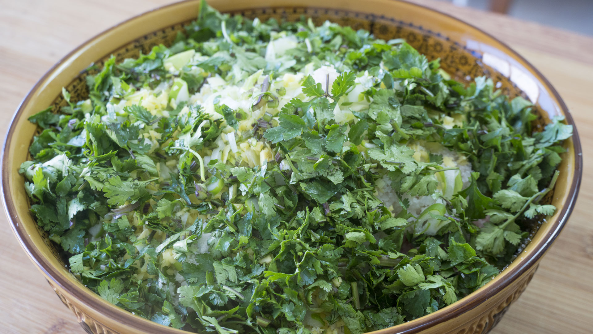 步骤6、再来切点香菜,炸丸子加点香菜味道会超级的香,切碎就可以;