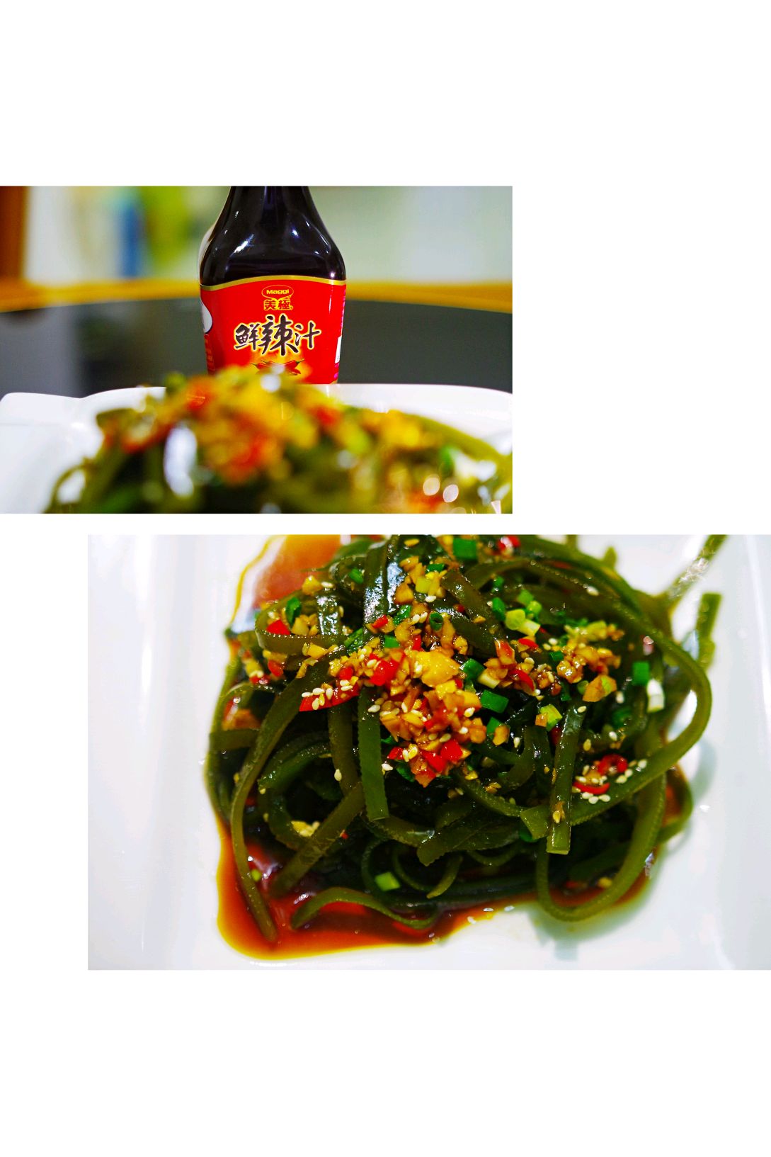 2.第一次用美极的鲜辣汁,味道很不错,用了一勺的鲜辣汁,辣度刚刚好,微微麻,对于吃不了花椒的广东人来说,这个鲜辣汁实在是太好不过了,我家温先生说:终于不会担心吃到花椒嘴麻了!这个凉拌海带丝太好吃了!