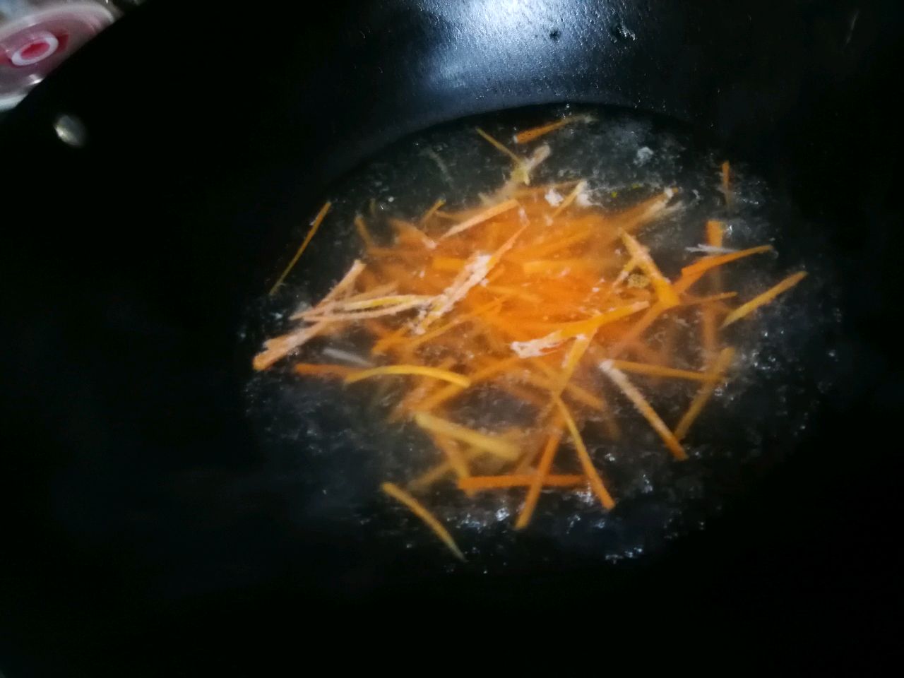 步骤3、准备红萝卜切丝,焯水控干水分。
