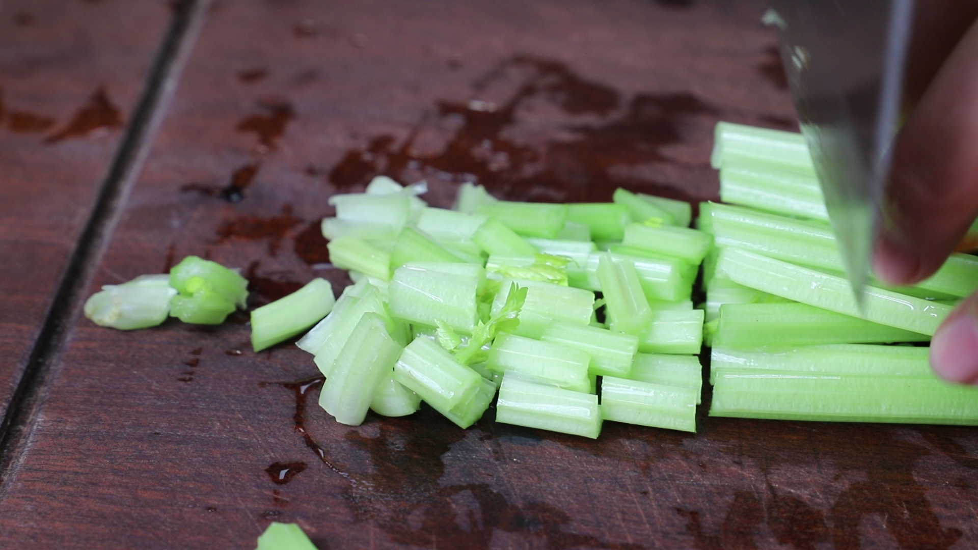 步骤8、放入胡萝卜丁和香芹,放入盐,鸡精,白糖,生抽,花椒油,拌匀