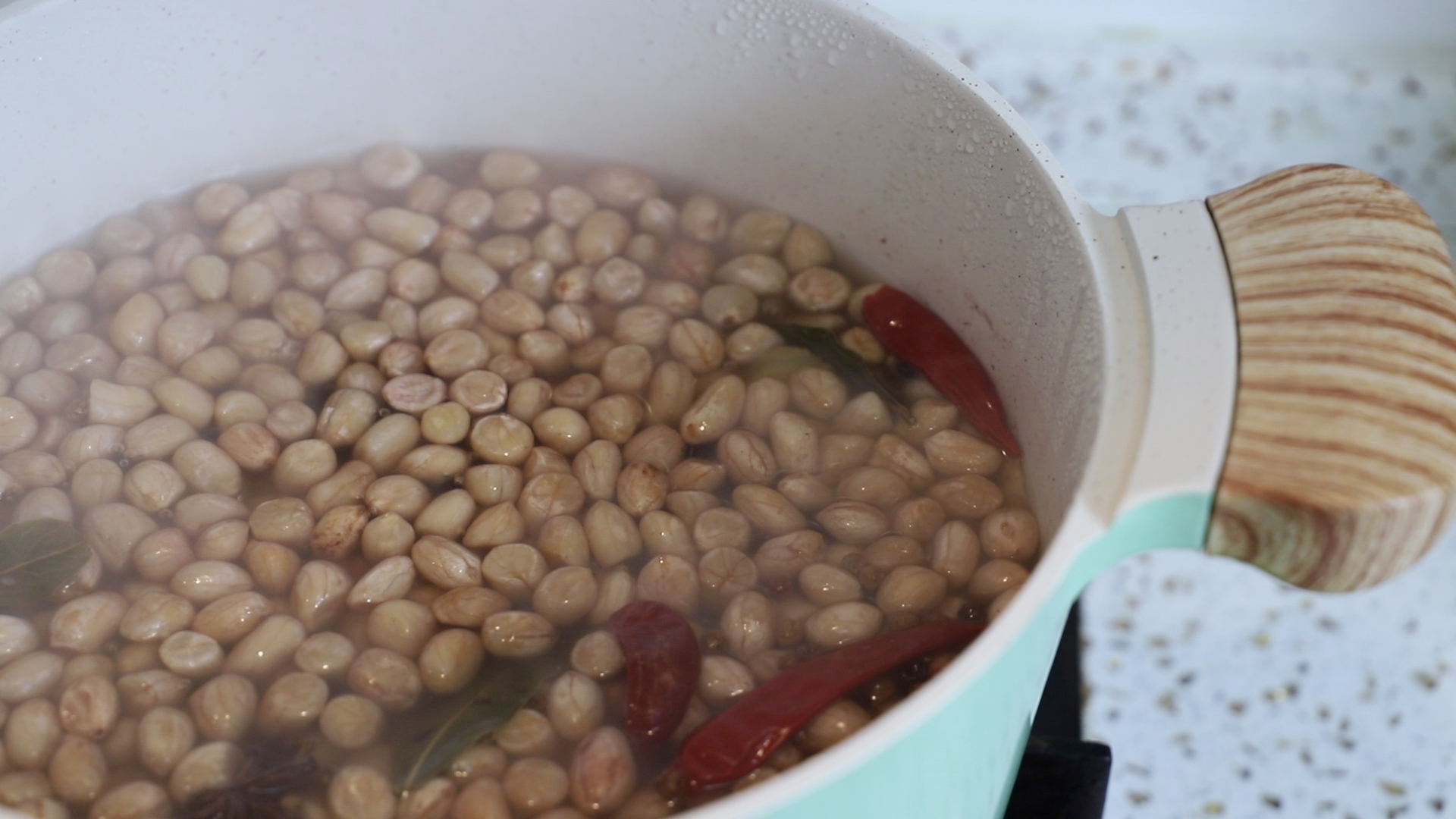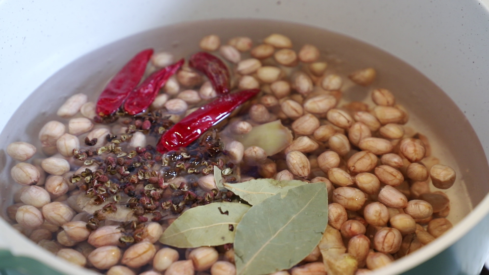 步骤4、泡好的花生米冷水下锅,放入姜片,花椒八角香叶,干辣椒,盐,开锅后煮十分钟
