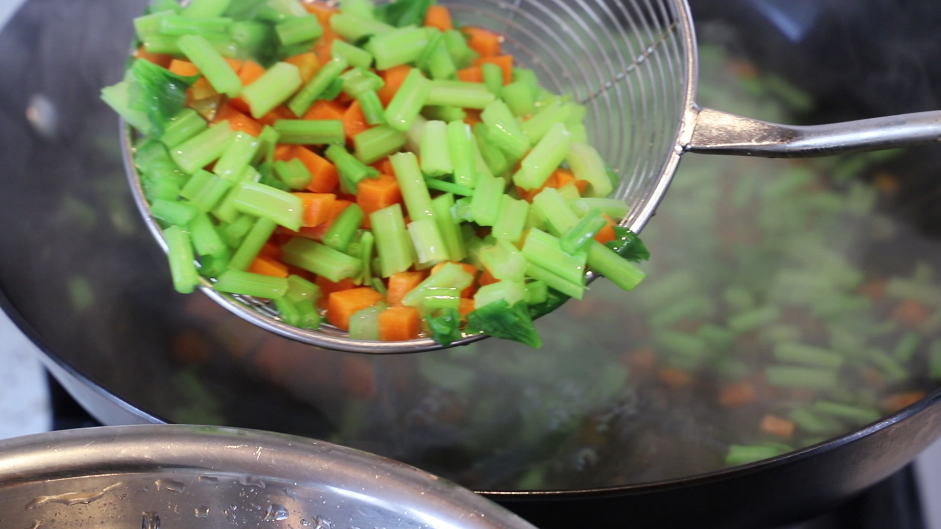步骤6、把胡萝卜丁和香芹丁放入开水锅中烫一下捞出