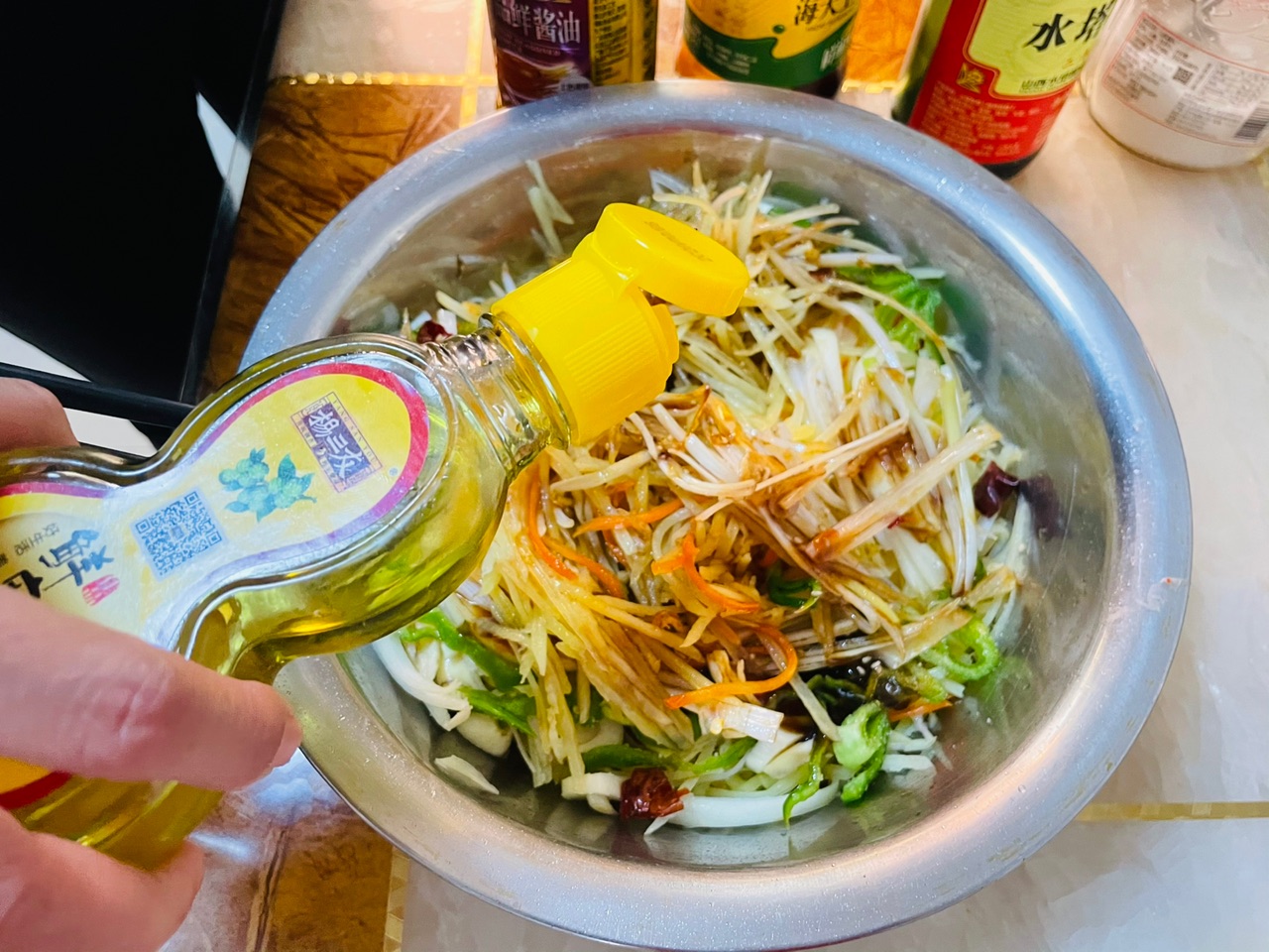 步骤1、土豆切丝焯水➕葱丝➕干辣椒➕蒜末➕辣椒丝➕淋热油