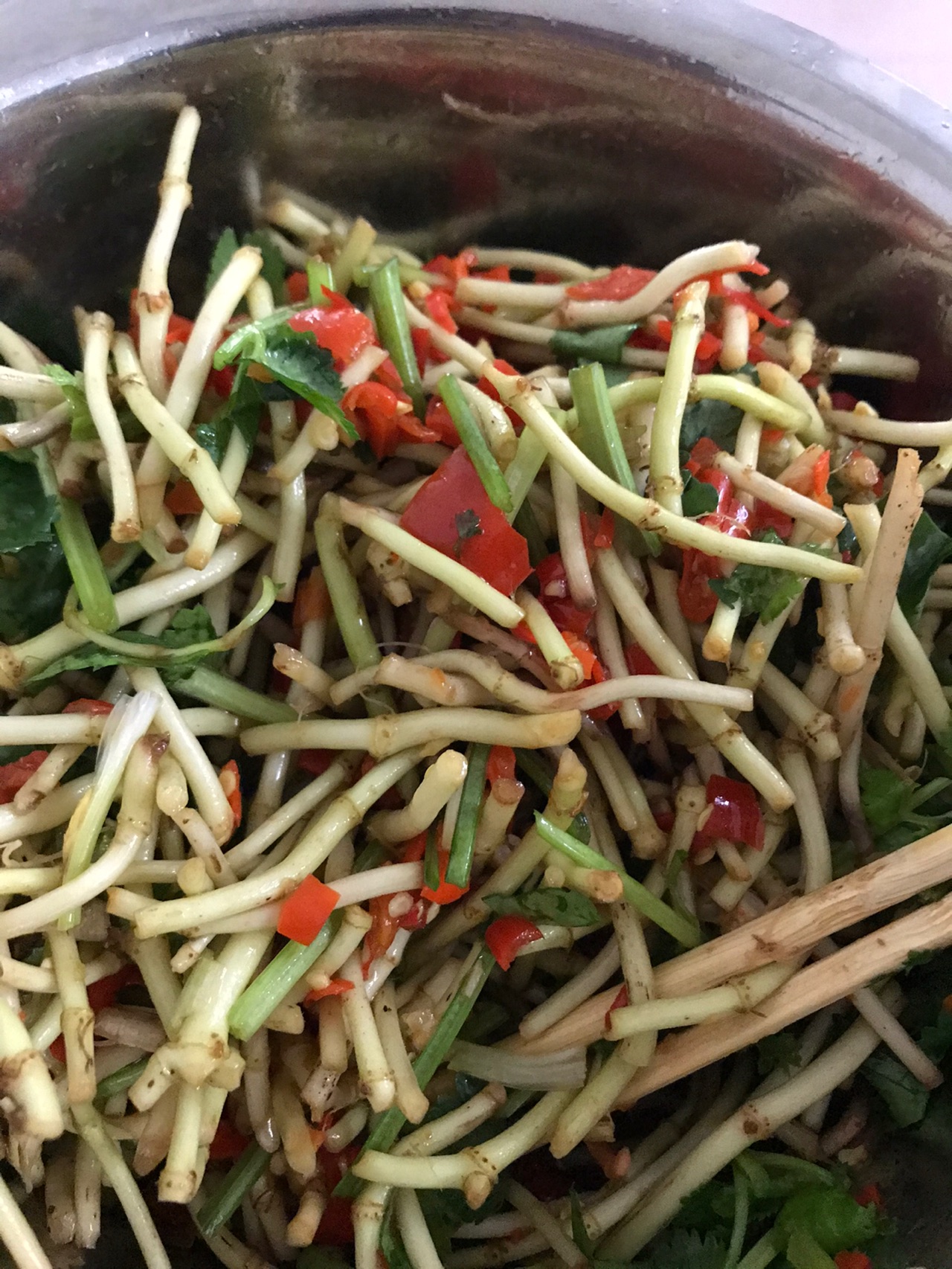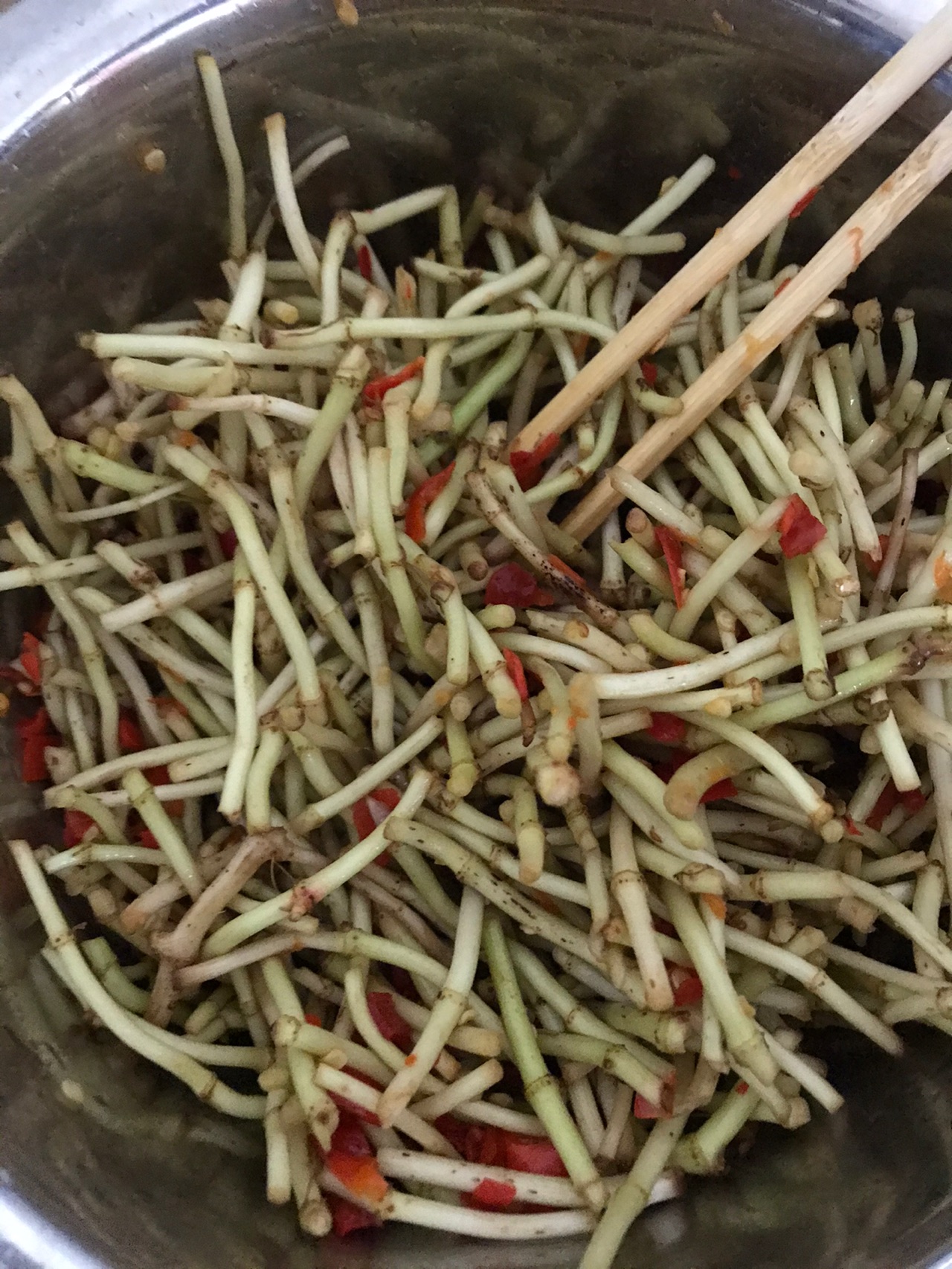 步骤1、折耳根洗净掐断成你喜欢的长度,我喜欢3厘米到5厘米左右的,吃起来比较爽。用少量的盐拌匀腌制30分钟左右。