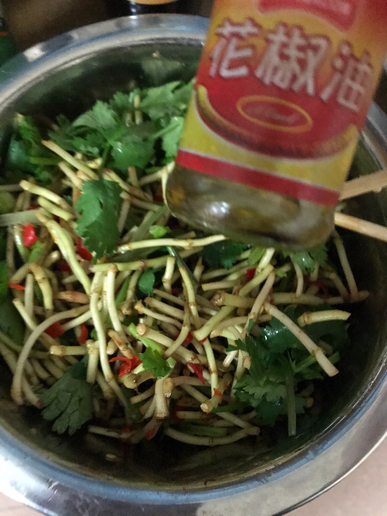 辅料:醋适量、生抽适量、剁椒50克、芝麻油少量、藤椒油少量、香菜4根