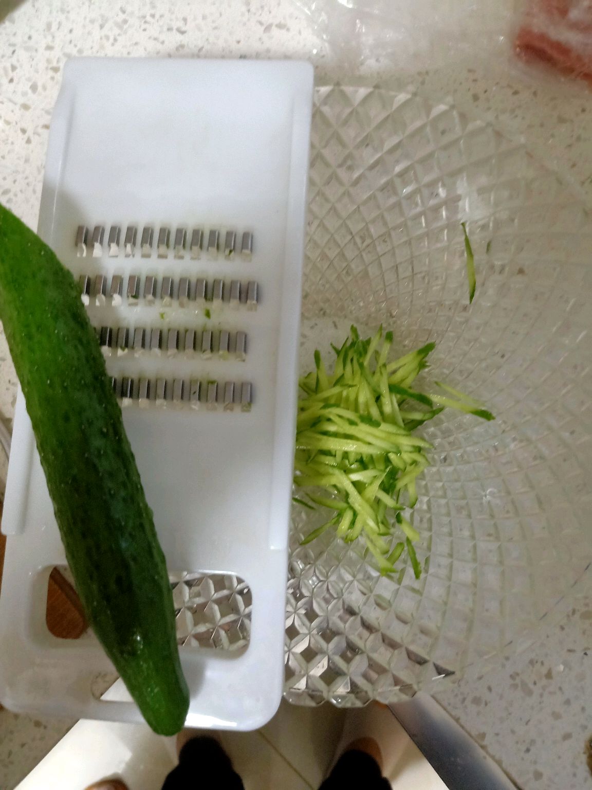 步骤3、黄瓜,胡萝卜擦丝,香菜切小段