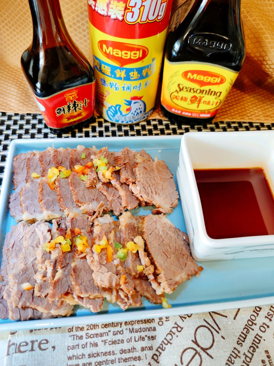 牛年开运菜-卤牛肉,一碟卤牛肉,蘸着美极鲜辣汁和美极鲜味汁调得汤汁,美味着呢