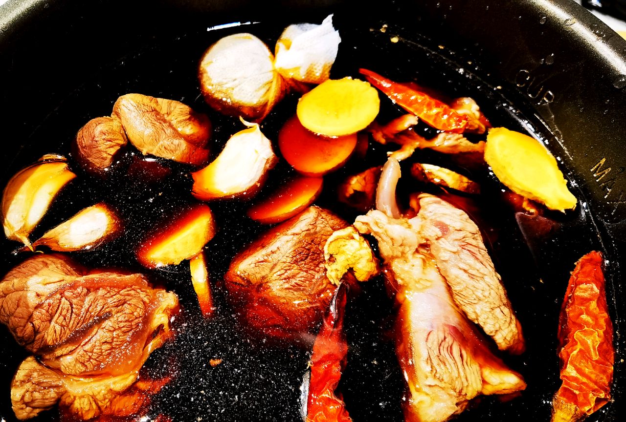 辅料:八角2个、花椒20粒、桂皮1块=1/3根、生抽5勺、老抽3勺、料酒4勺、冰糖5块、香叶2片、盐20克、干辣椒️5个