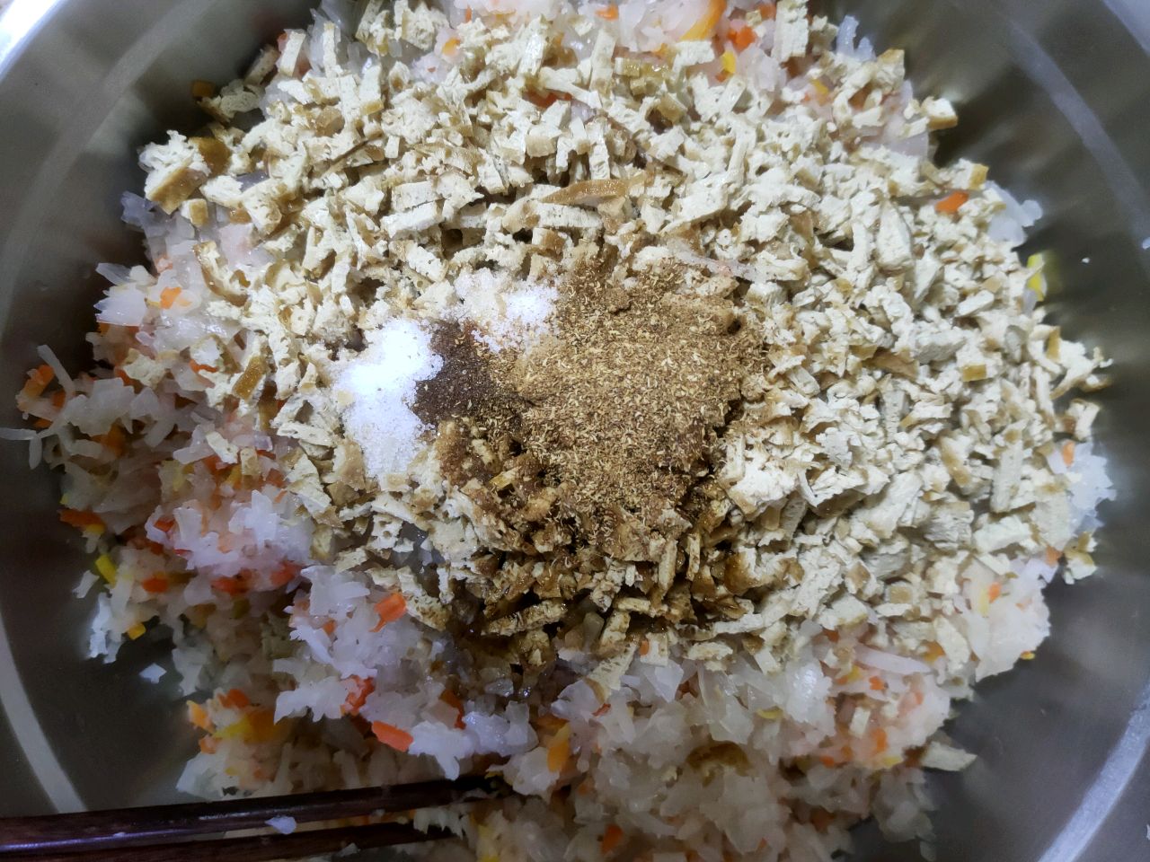 步骤4、萝卜煮熟捞出,所有食材剁馅,加入调料拌匀