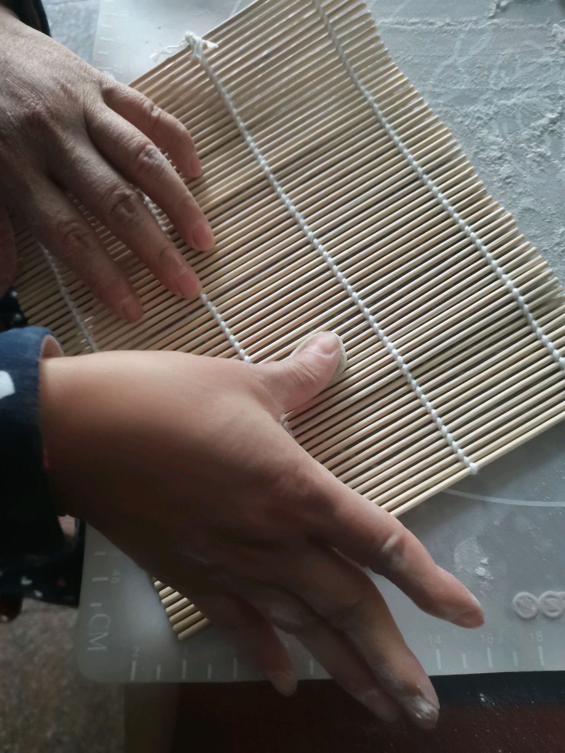 步骤7、取出寿司帘,拿一个面团,用大拇指按住,轻轻往前推动。