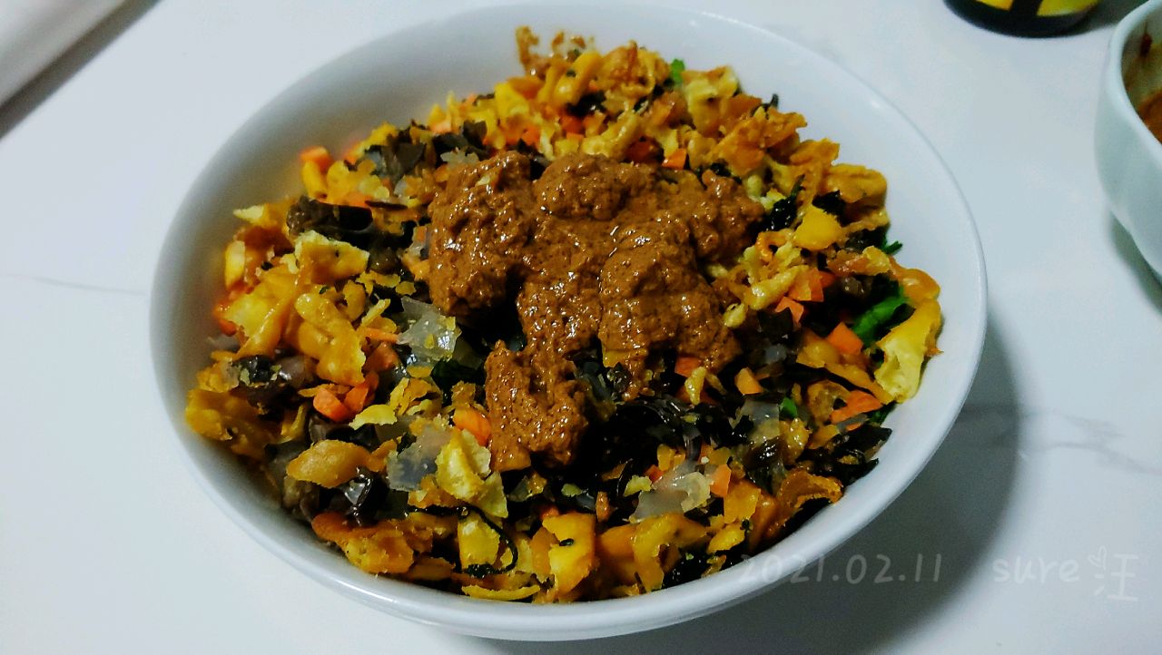 辅料:鸡蛋干可选、粉皮自选、木耳一小把、胡萝卜可选、炸货自选、芝麻酱一份+、酱豆腐两份、面粉看馅量、酵母粉看粉量