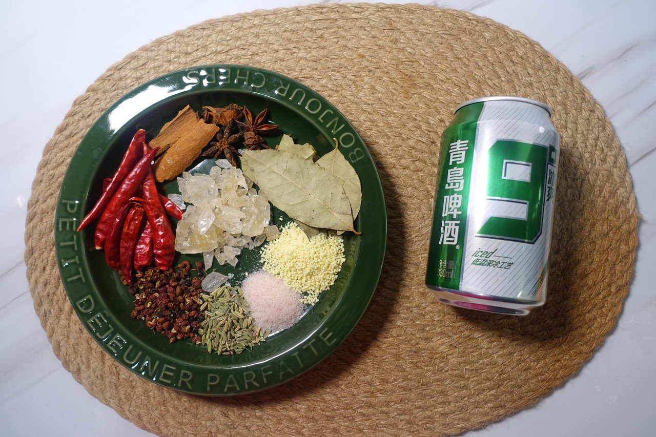 辅料:料酒50克、葱1根、小茴香5克、桂皮1块、香叶5片、干辣椒5个、花椒5克、八角4个、生抽50克、老抽15克、盐5克、冰糖30克、鸡精5克、啤酒1瓶330g、水适量