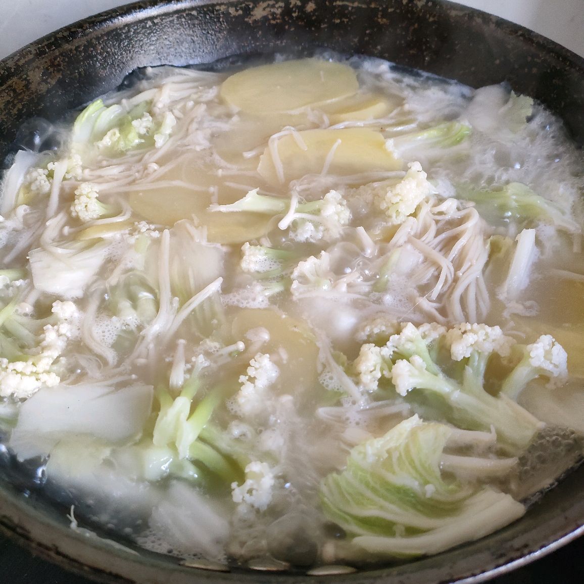 步骤2、蔬菜加入锅中,和宽粉一起煮至开锅,开锅后再继续煮5分钟后捞出。