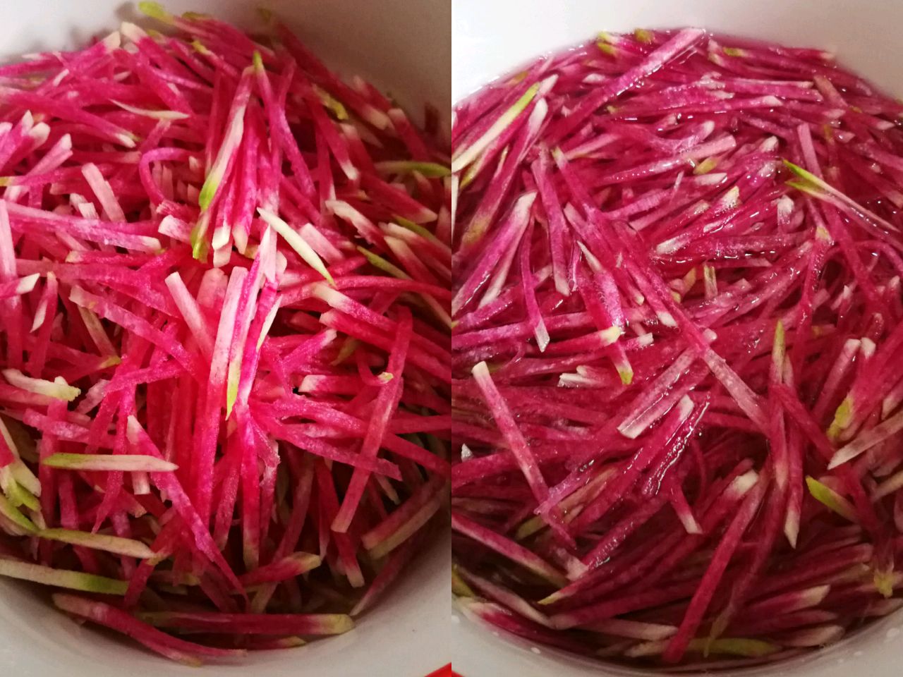 步骤1、把罗卜洗干净,削皮刨成丝,放入凉开水浸泡10分钟(既说浸泡过的罗卜丝口感更脆),捞出沥干水分。