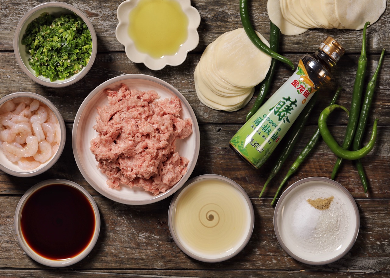 步骤1、准备好所有的原材料,建议用猪后腿肉搅成肉泥,口感更好,线椒切碎,虾仁清洗干净即可。