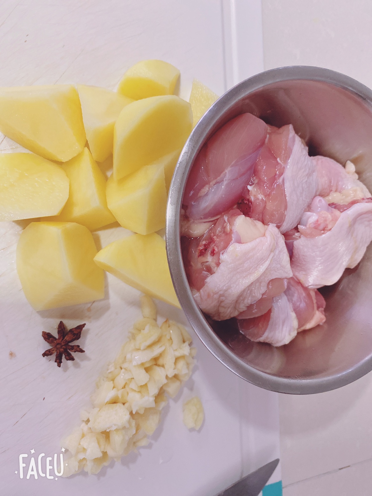 步骤1、鸡腿斩成块、马铃薯去皮切块、蒜切末备用