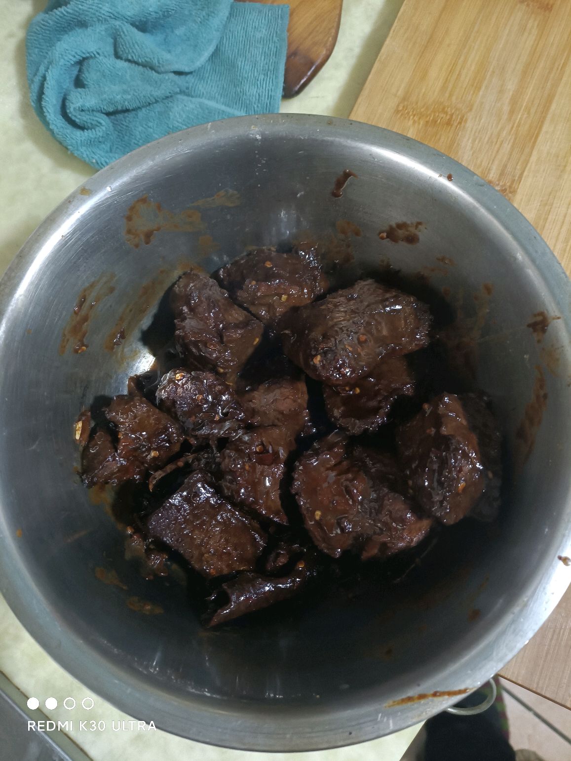 步骤15、炒干水了就差不要多了,这样炒的牛肉,不柴有有嚼劲,味道更好,余味更香!