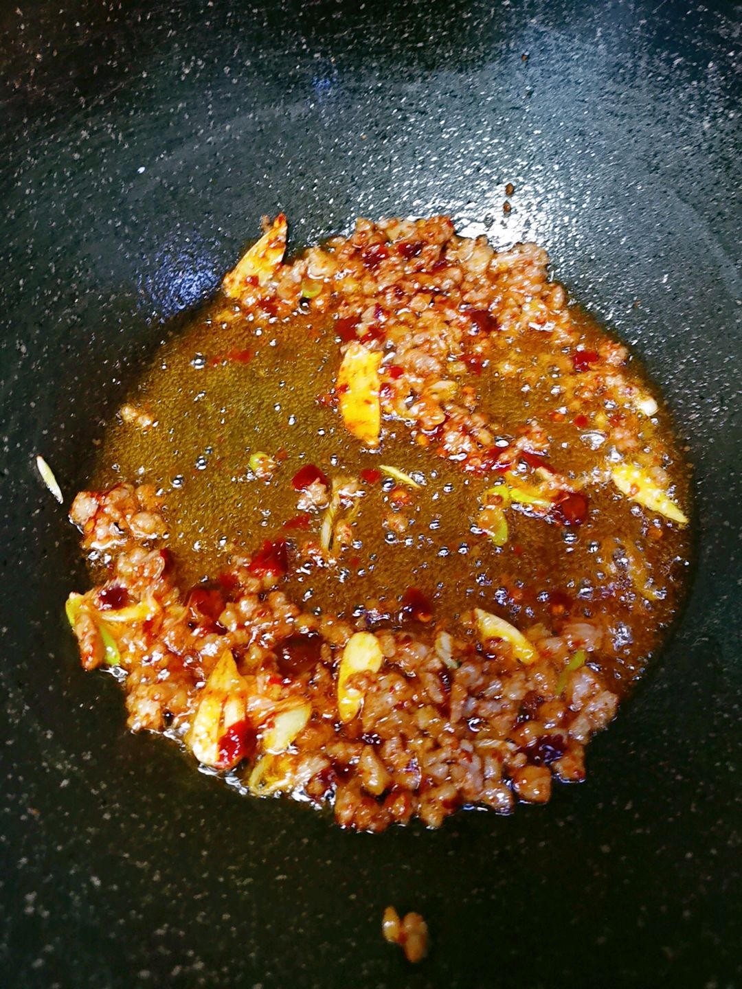 步骤3、起锅烧油,油热下入葱姜蒜炒香,放入肉馅炒至变色