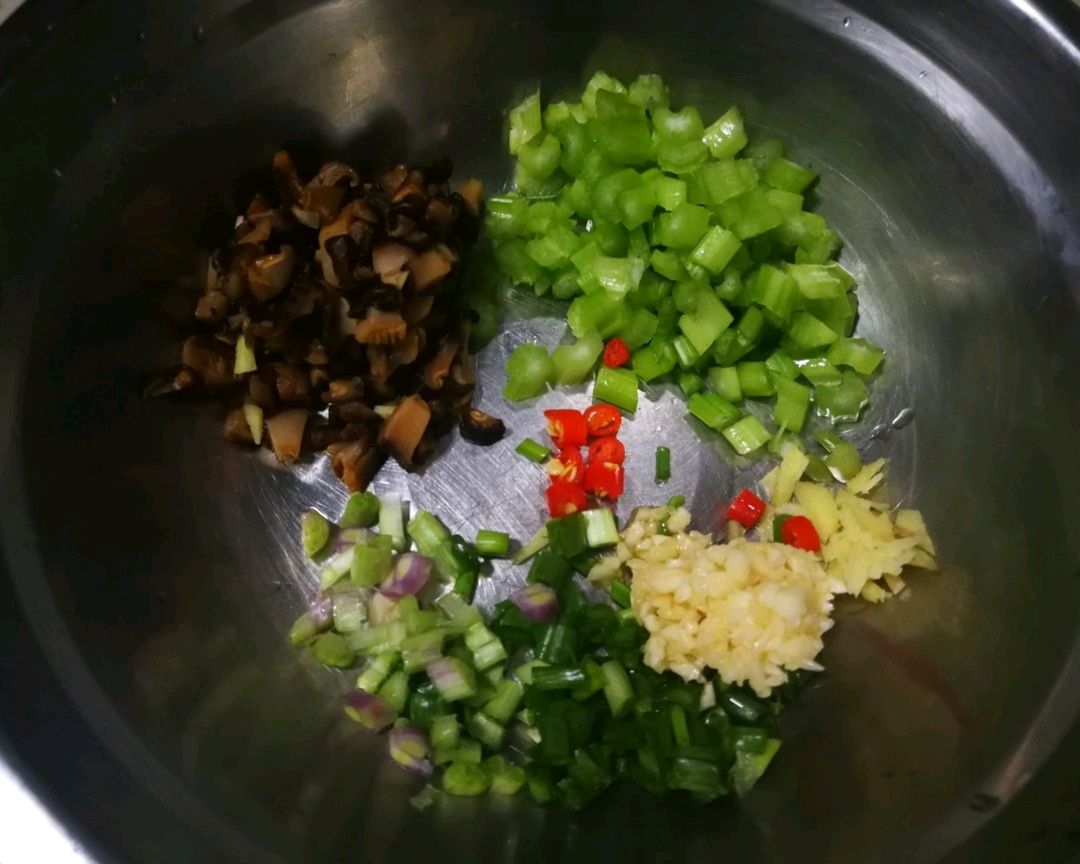 辅料:豆瓣酱小勺、盐适量、生抽1勺、香菇3朵、姜葱蒜适量、芹菜适量、小米椒1个