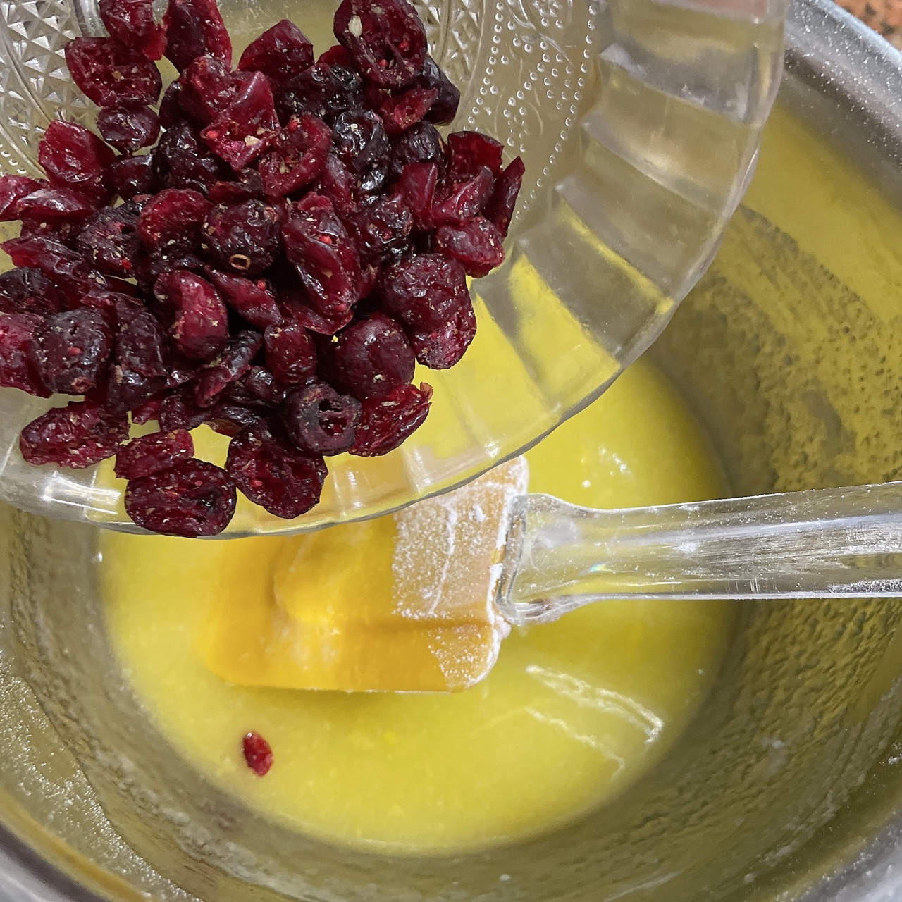 步骤3、3.将蔓越莓干倒入黄油中搅拌均匀