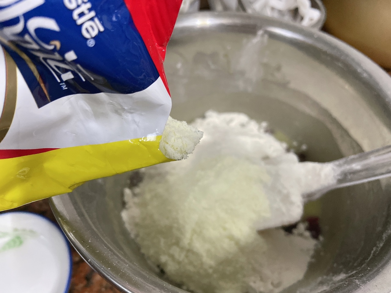 步骤4、4.筛入称好的低筋面粉和奶粉,用皮铲搅拌均匀