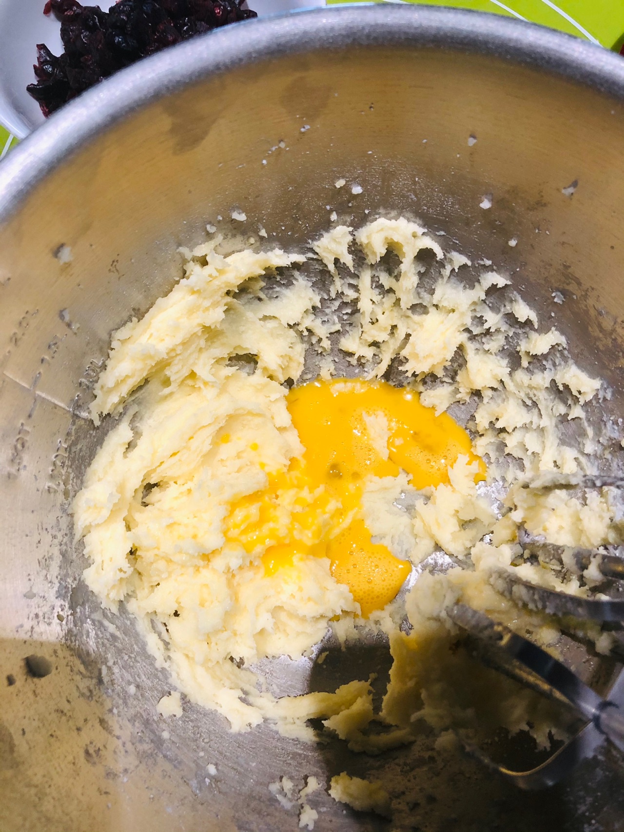 步骤1、用电子称把食材准备好,鸡蛋打散备用,蔓越莓切丁备用。
