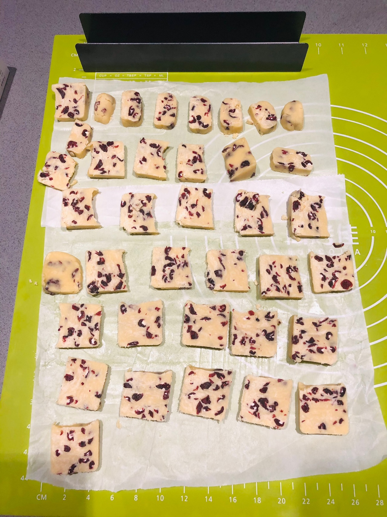 步骤5、看着时间差不多的时候就把烤箱预热,上下烤170度10分钟。然后把冷冻好的饼干胚拿出来用刀切成厚度尽量一致,烤盘内放吸油纸放入烤箱中层,温度170度18分钟。