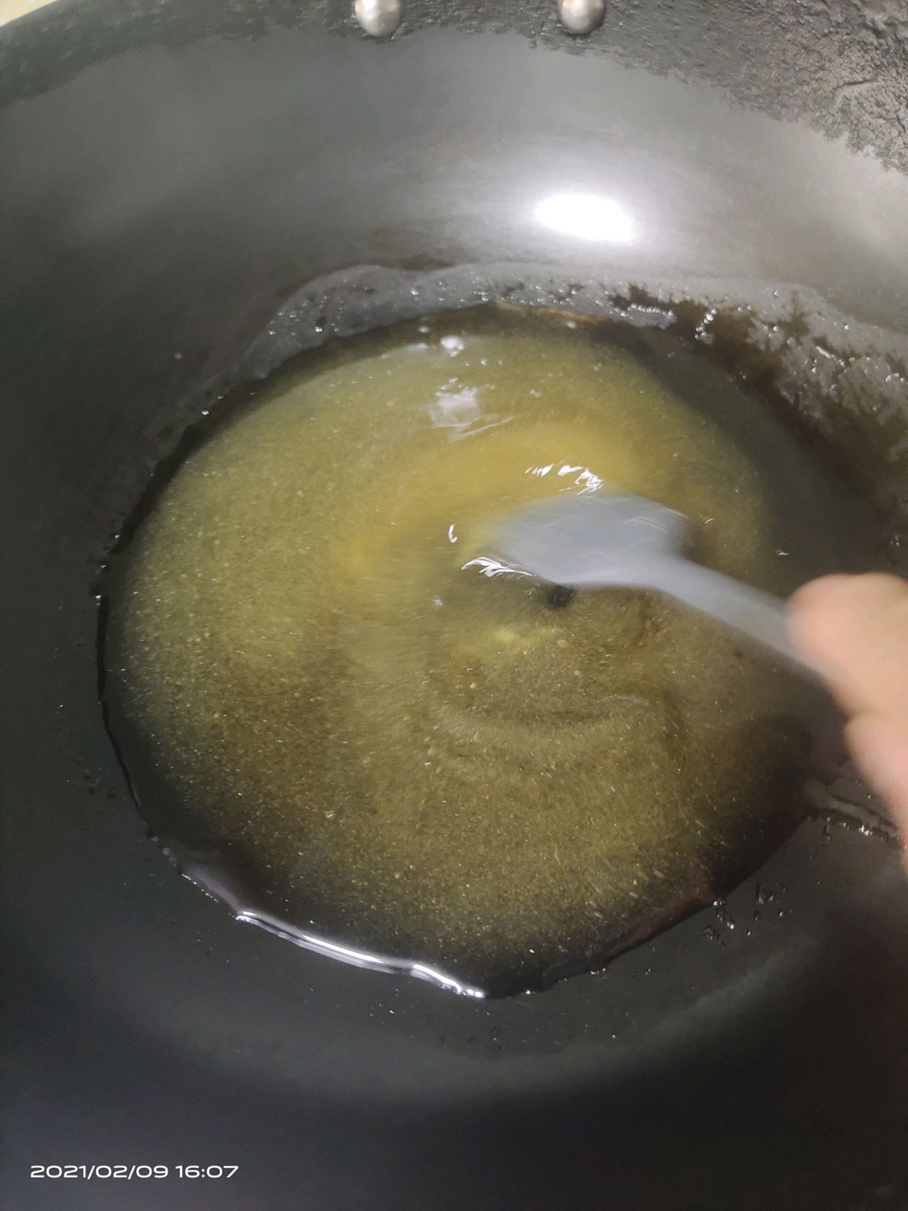 步骤11、小火,倒入糖浆类熬,顺时针搅拌