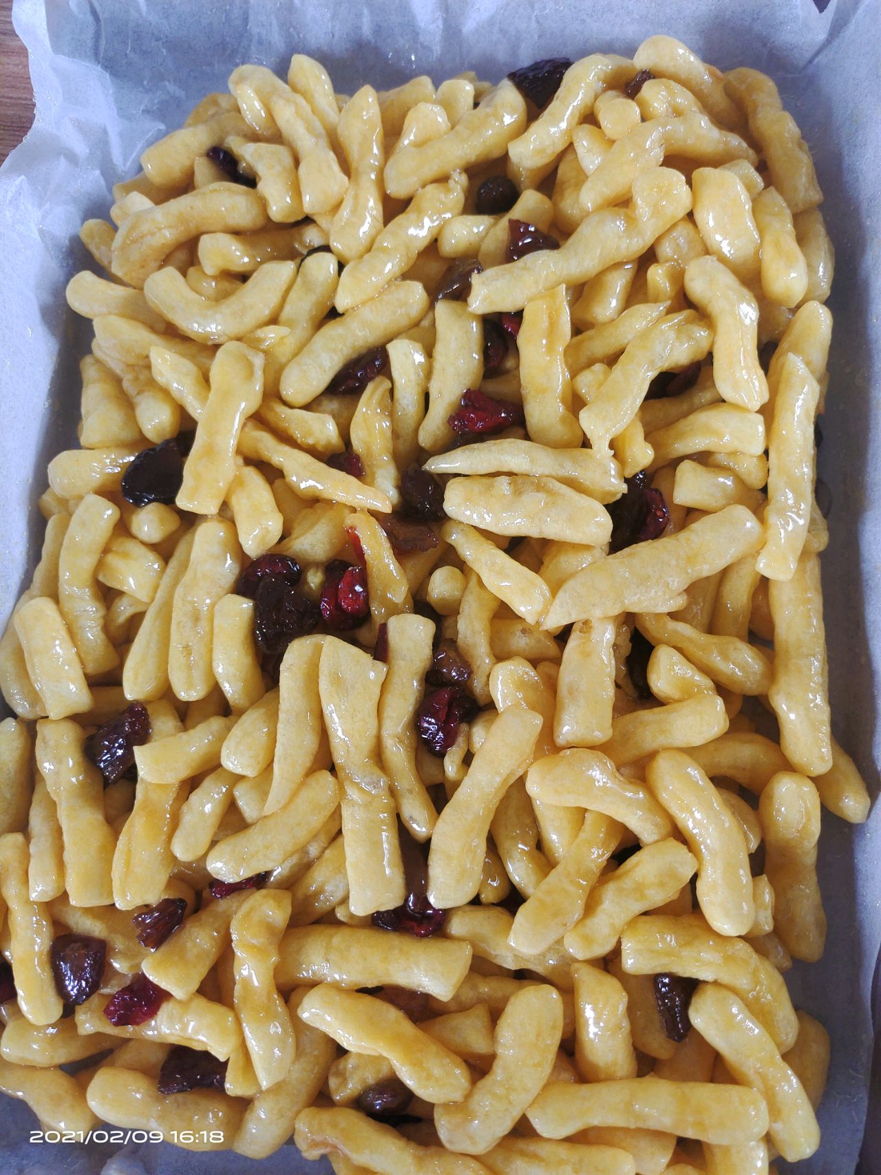 步骤13、倒入炸好食材、蔓越莓和葡萄干,用烘培铲拌匀,再关火