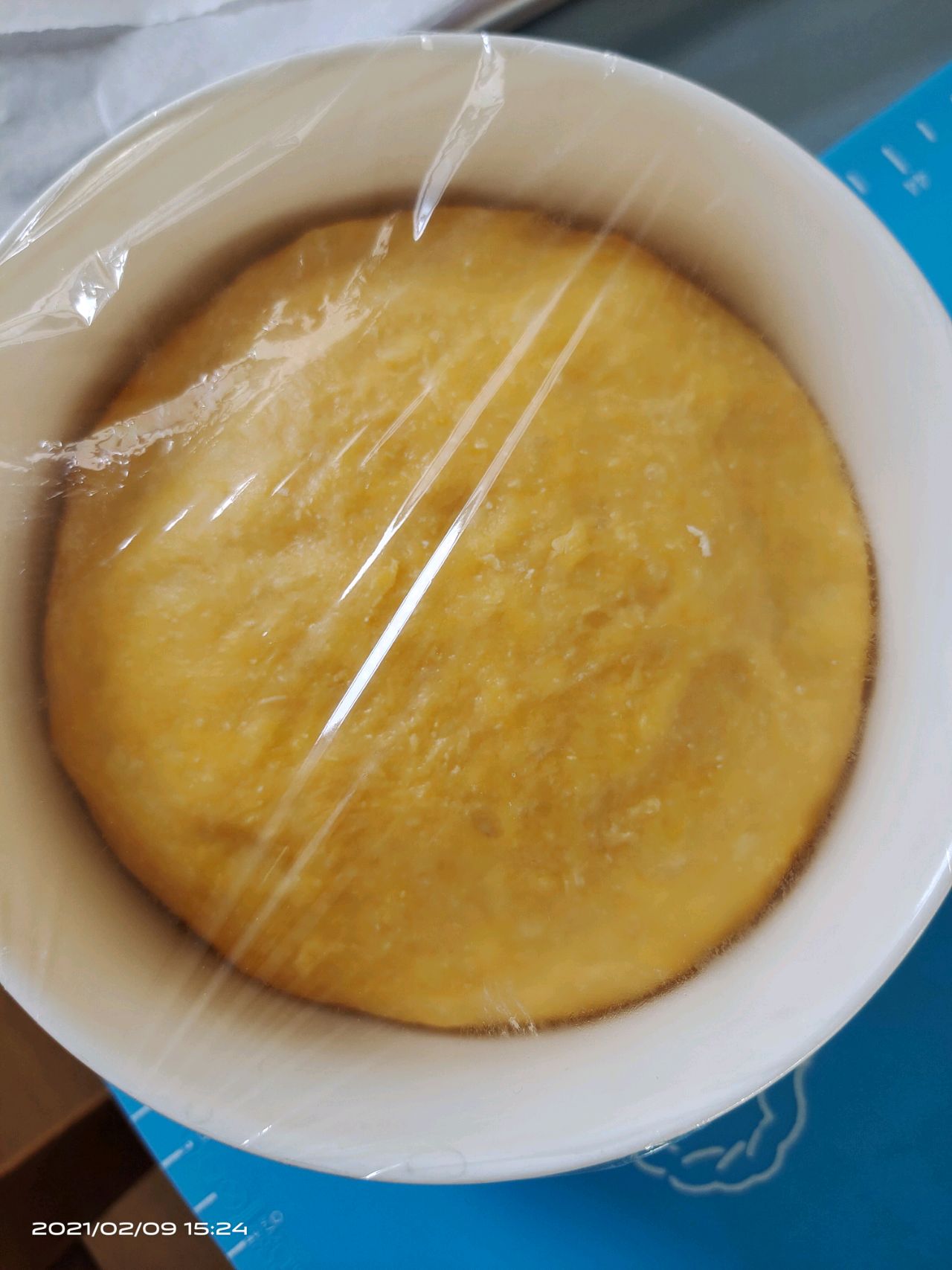 步骤2、手抹多一点的面粉,把面团揉成光滑面团,碗封保鲜膜,盖盖子进行发酵接近一倍
