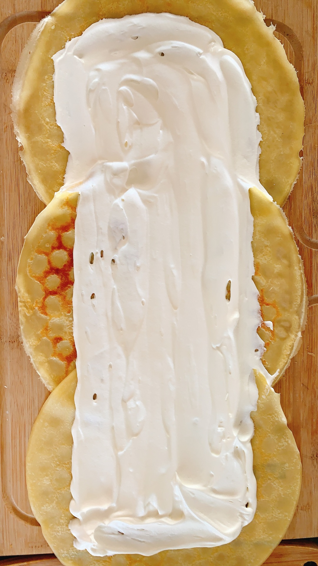 我们家的电饼铛完全不粘所以我用的电饼铛,朋友们家里用不粘平底锅会更好~每烙一张饼皮一定要等锅降温再烙下一张,不然的话你可以尝试一下就知道了饼皮面糊最好用筛子滤几遍,会更细腻,噢对了黄油需要隔水化开,或者用玉米油橄榄油都可以进行替代~