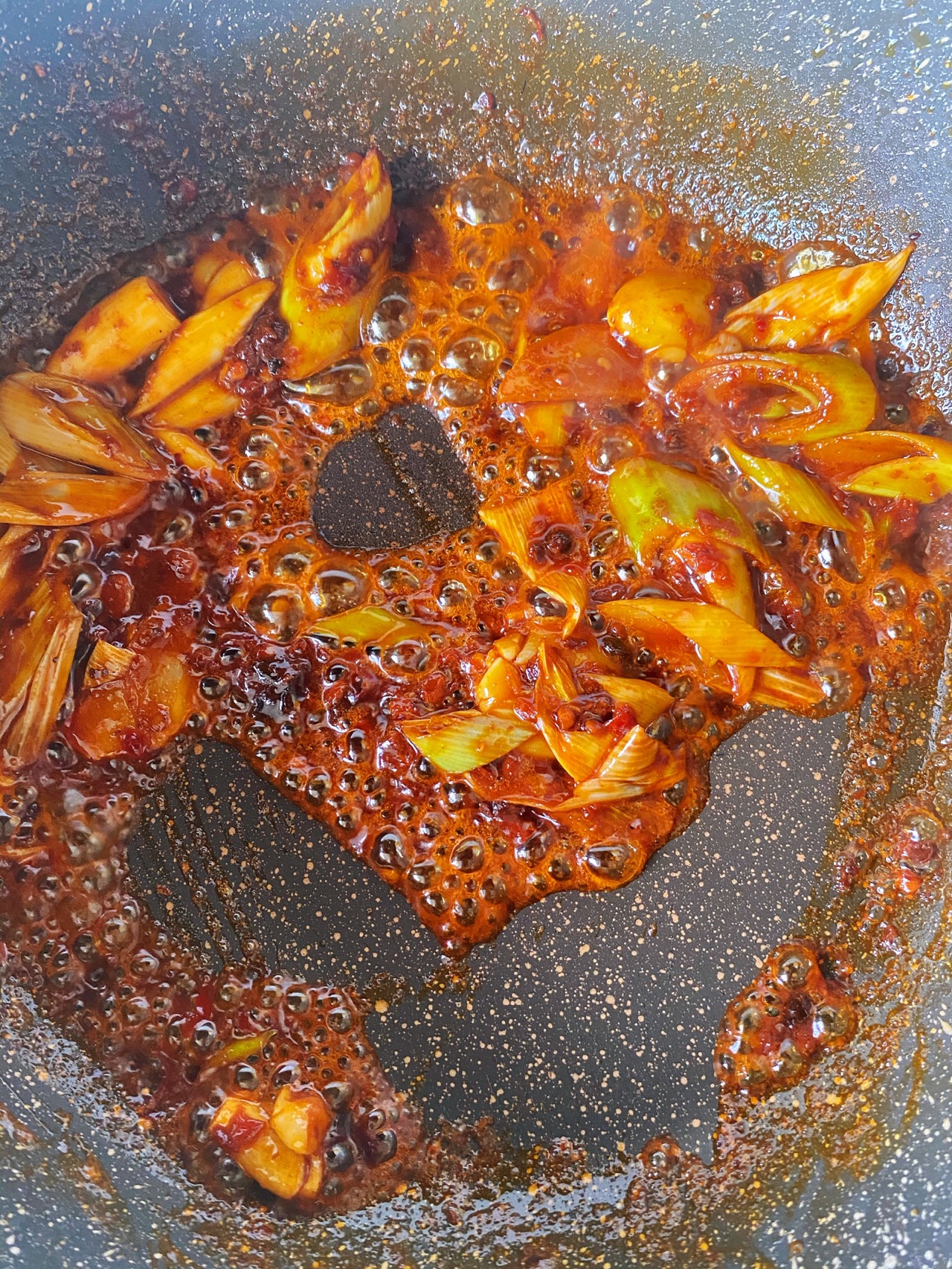步骤2、放入一勺郫县豆瓣酱、一块火锅底料,一定要炒香、超透;