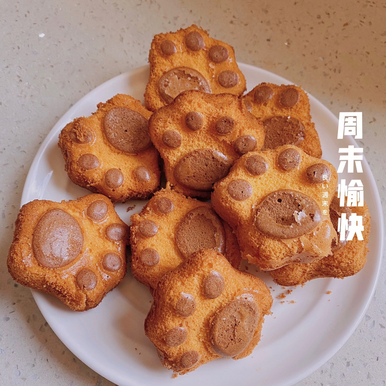 步骤2、烤盘先刷油将一点面糊和巧克力粉混合装入裱花袋挤到猫爪垫的部分放入预热的烤箱150度1分钟后拿出挤入面糊