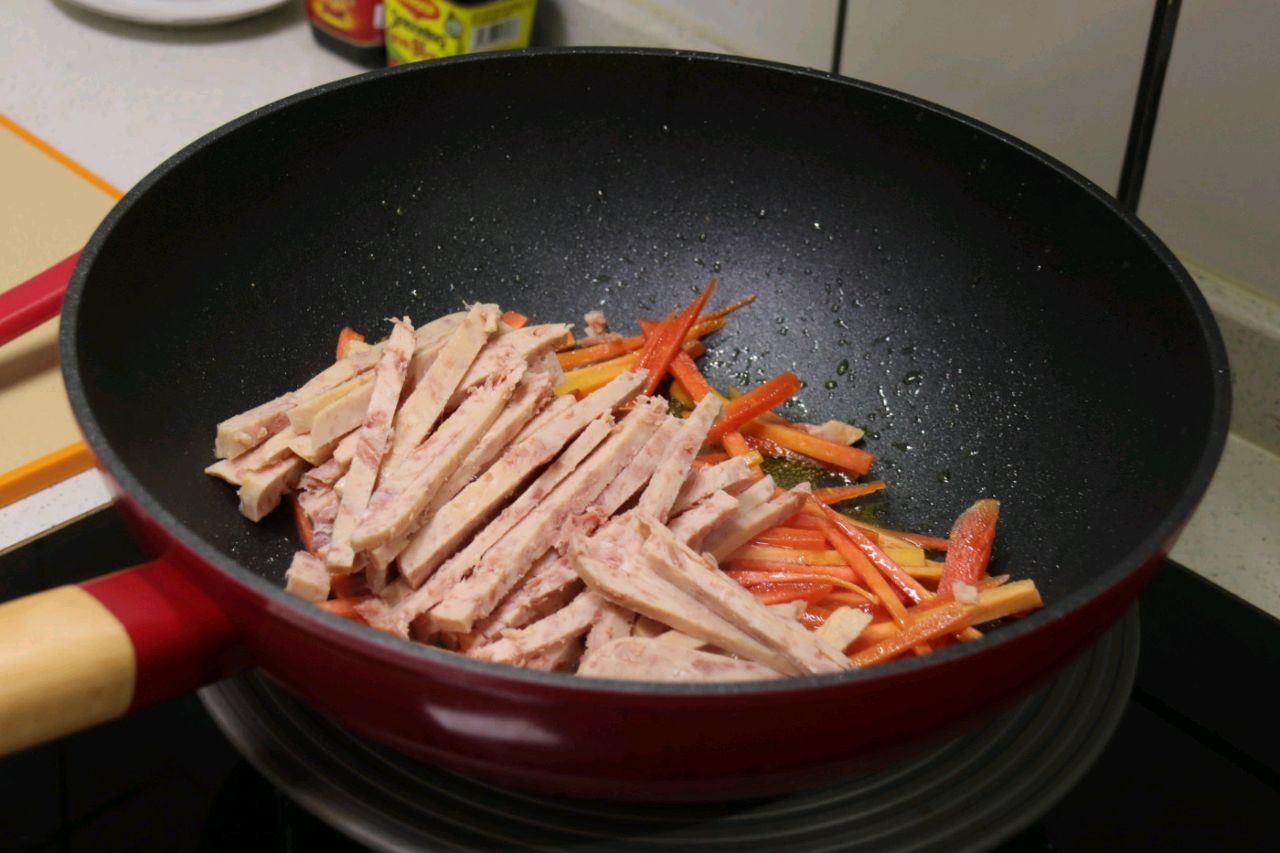 步骤15、加入午餐肉条炒匀。