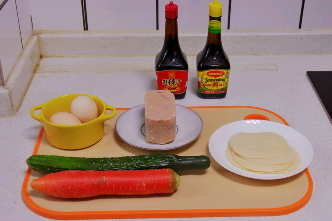 辅料:鸡蛋2个、黄瓜1根、胡萝卜1根、午餐肉1盒、美极鲜味汁1小勺、美极鲜辣汁几滴