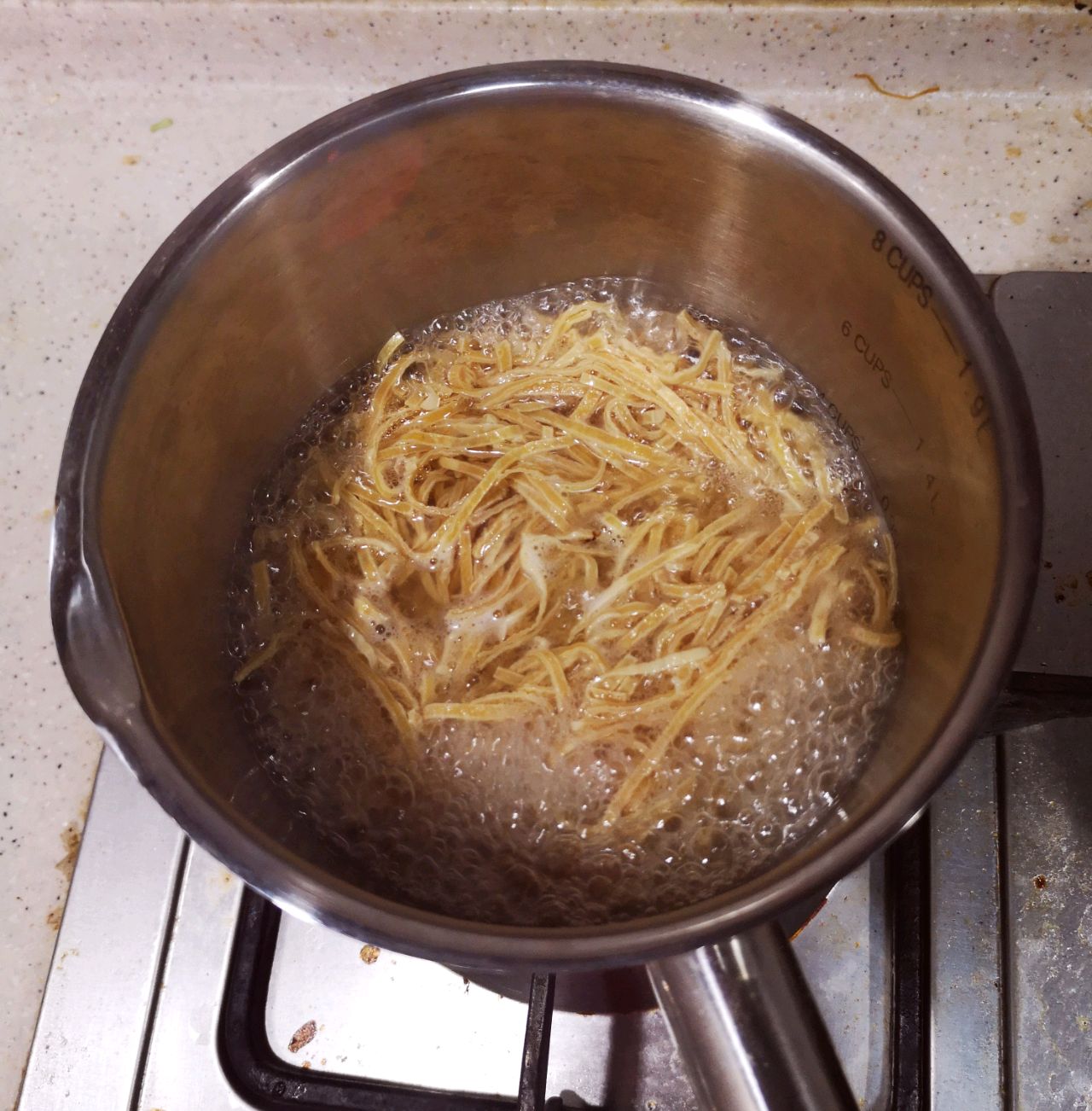 步骤3、锅里水煮开放干豆丝煮一分钟左右关火,泡两分钟左右,把水沥干…