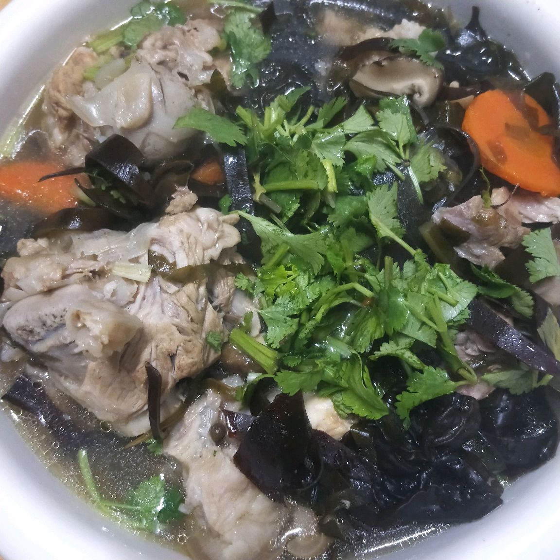 步骤1、准备好所有食材洗干净切好,把海带和木耳提前泡发洗干净切好备用,锅里加适量的清水加料酒把骨头焯水,然后用压力锅把焯好水的骨头和配菜还有需要大料和盐一起倒入压力锅里加热水或者开水按豆/筋键开始煮,大概一个小时左右就可以开吃了香菜点缀下