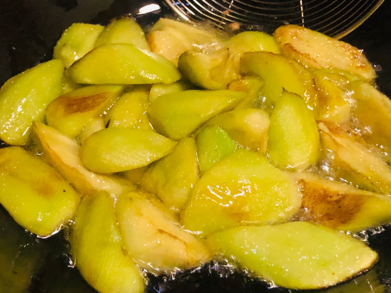 步骤6、炸至茄子变软,色微黄,盛出控干油备用。
