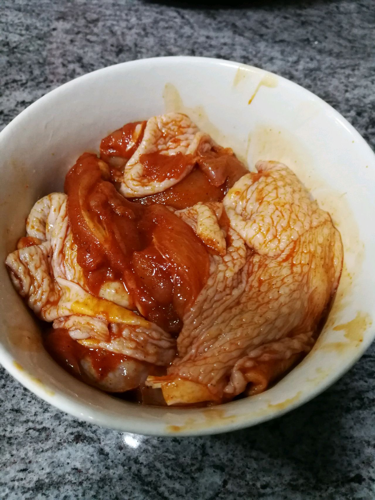 步骤2、处理好洗净的鸡腿肉倒入奥尔良烤翅腌料,可以多一些,用手拌匀,盖上保鲜膜放冰箱隔夜入味。不隔夜的话至少也要腌制两小时以上。