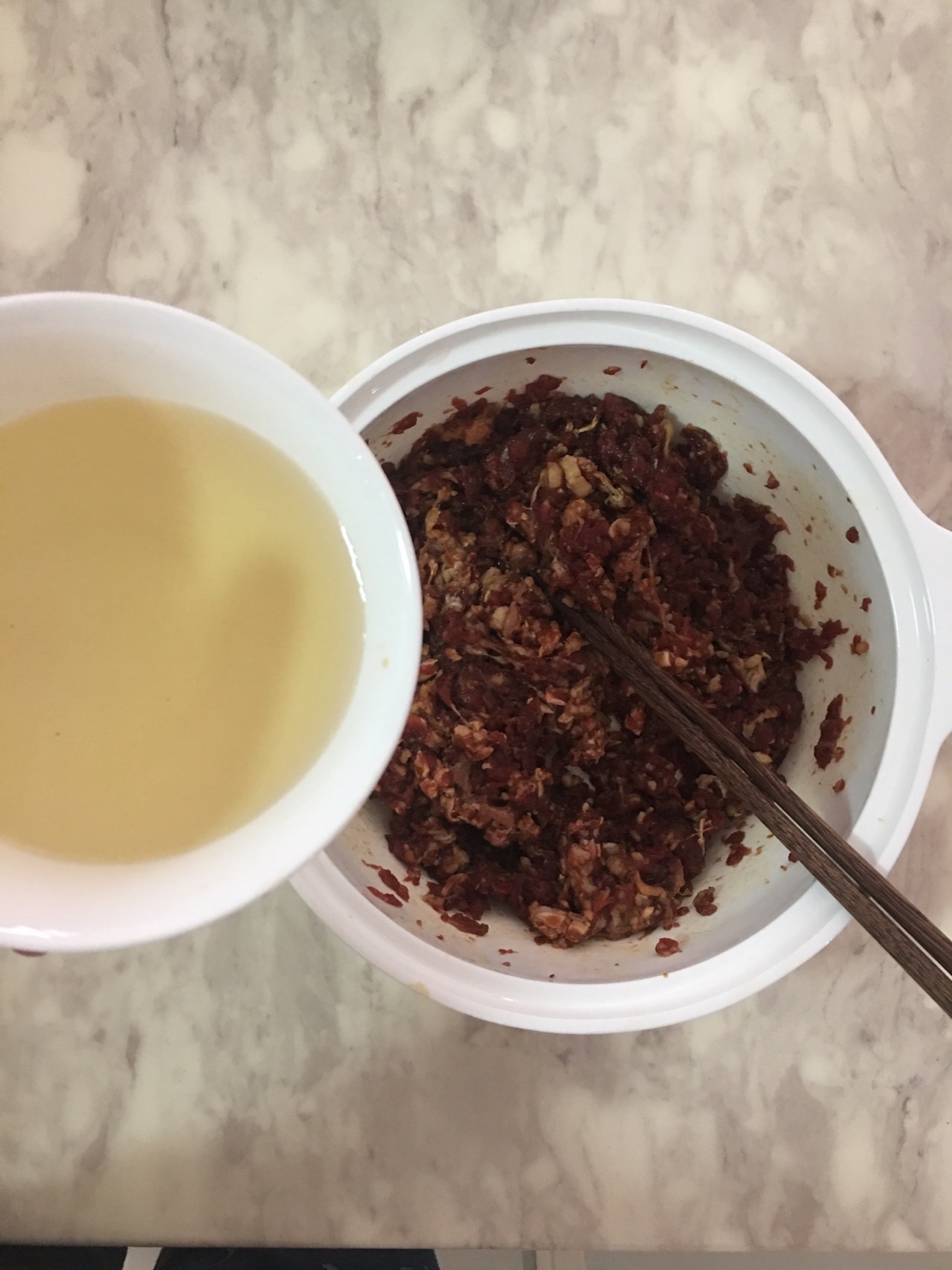 步骤4、牛肉加入除花椒水以外的材料,用搅拌机搅拌均匀。