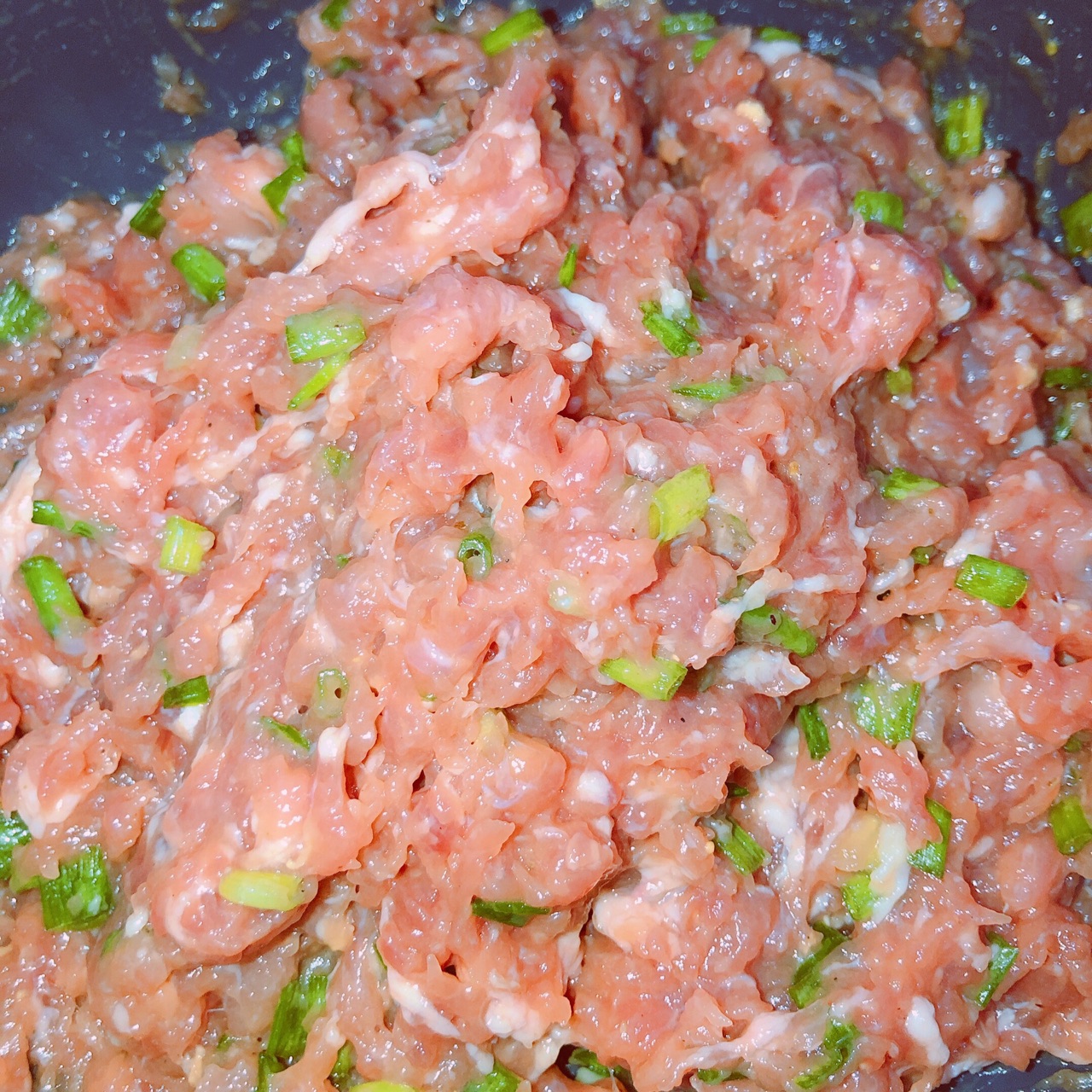 步骤1、肉馅中加鸡蛋、葱花、姜末、盐、糖、蚝油、生抽、老抽、料酒、芝麻油顺时针搅拌