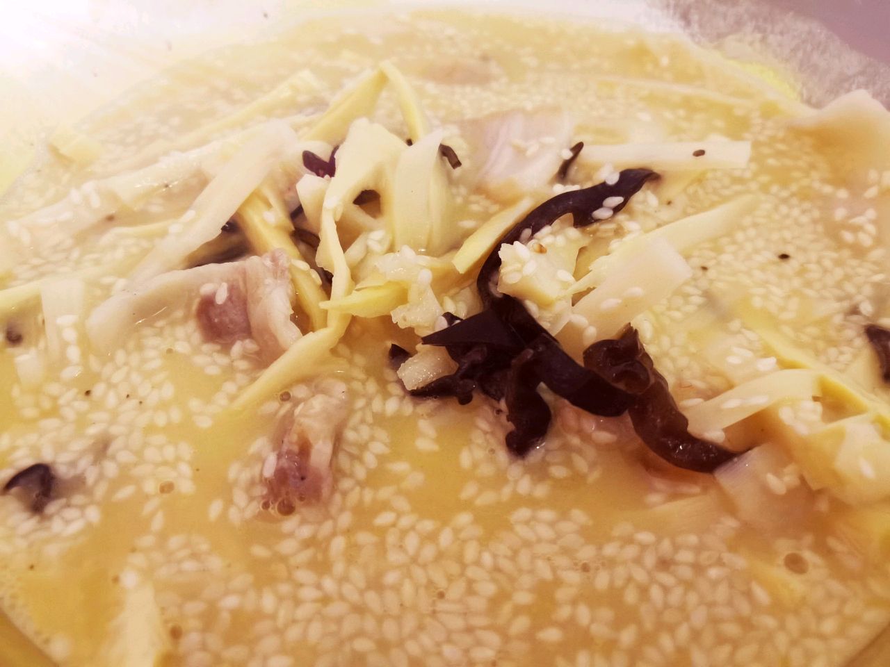 步骤1、备好食材将冬笋切丝黑木耳切丝五花肉切成薄片虾仁用淀粉包一层咸鸭蛋黄压碎
