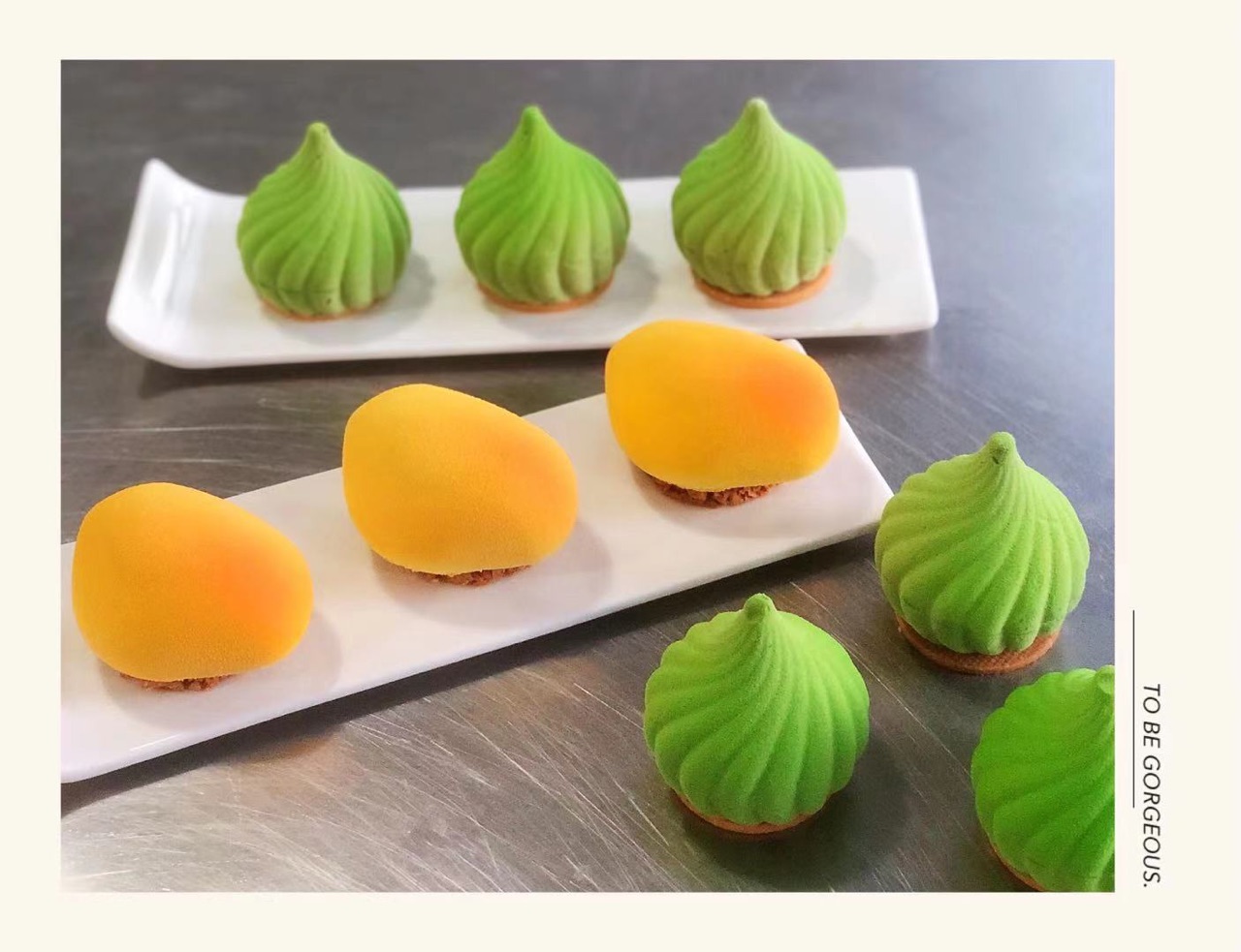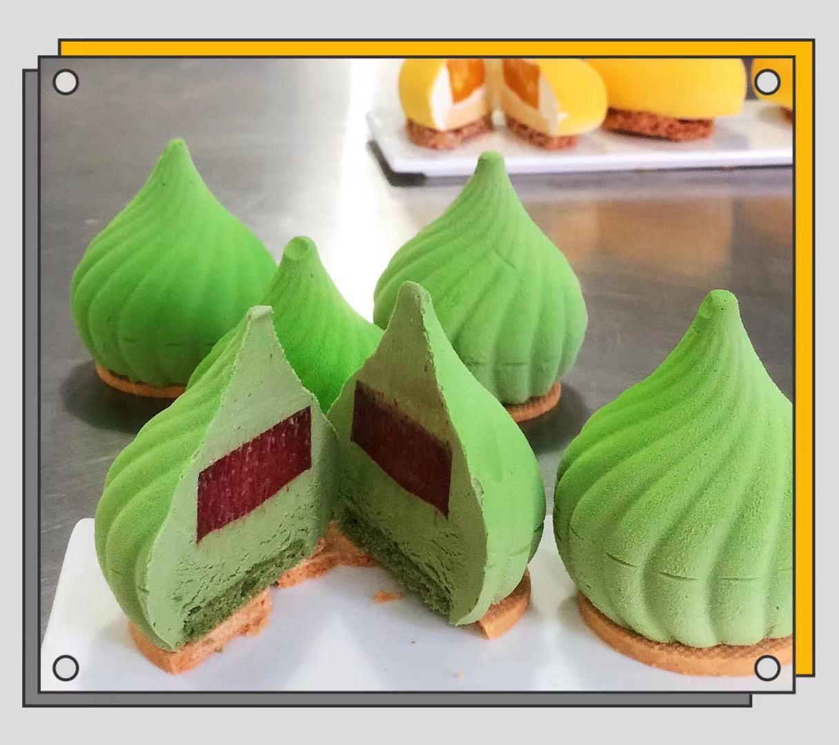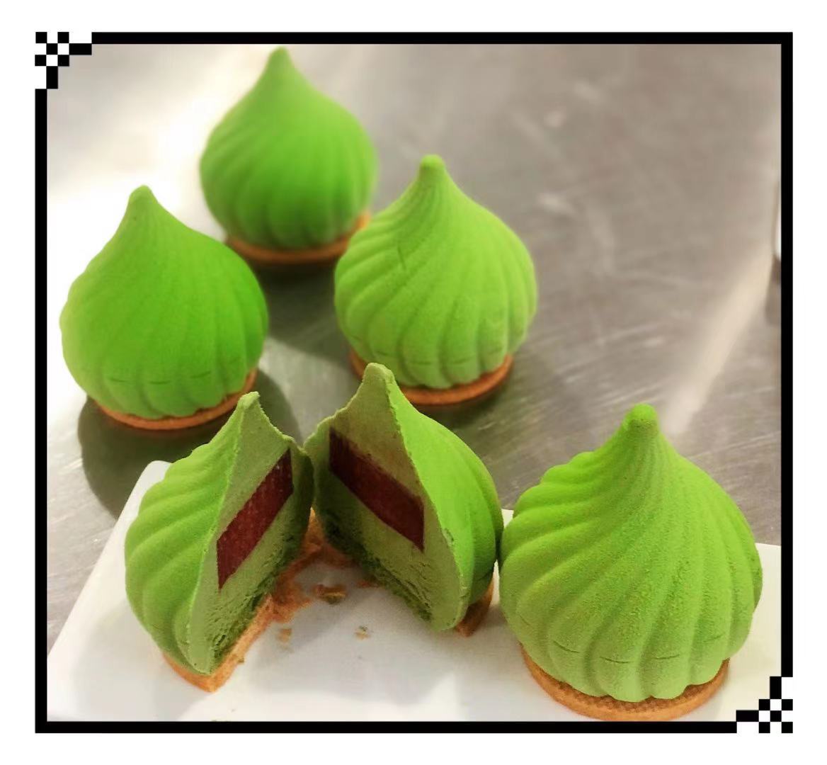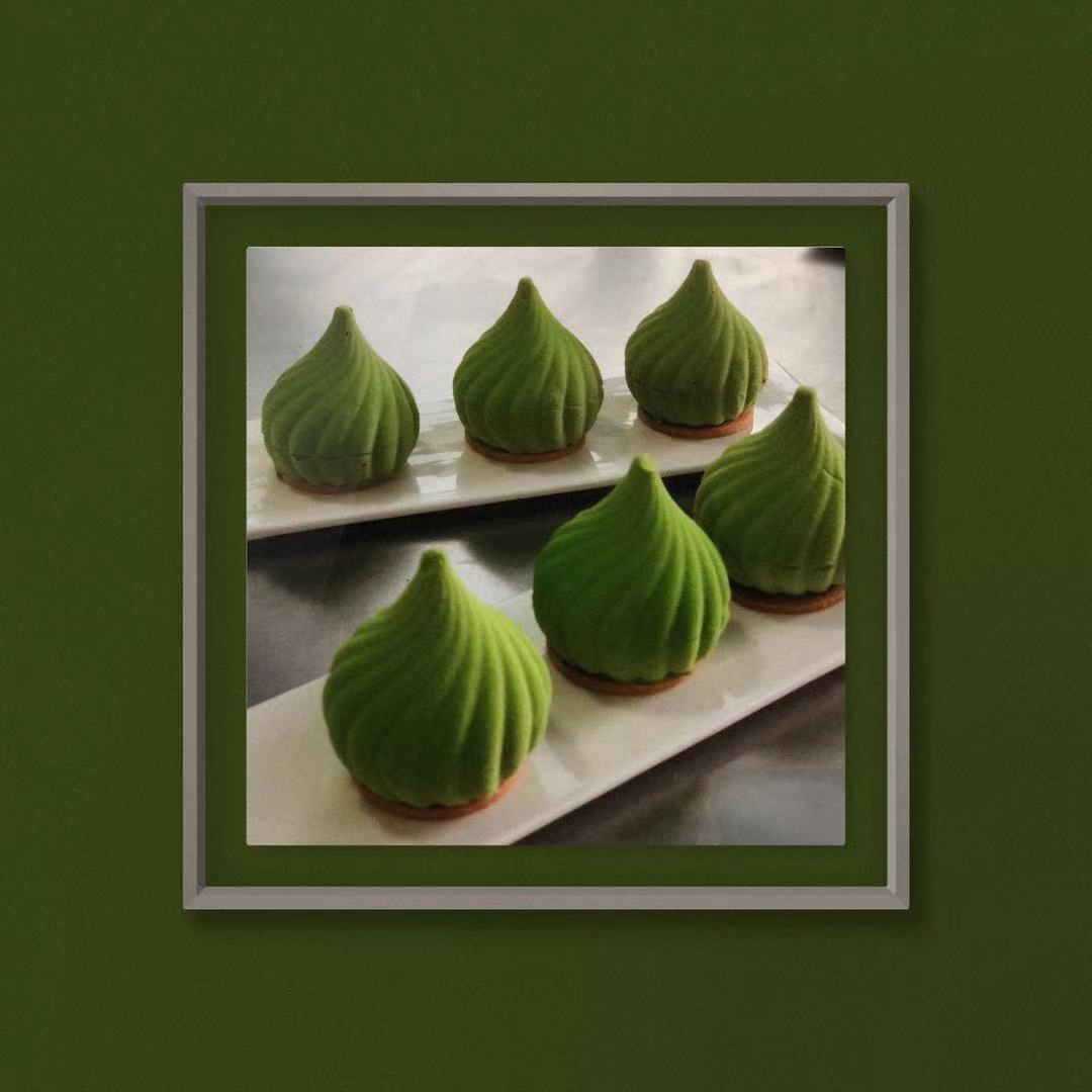 步骤12、「抹茶慕斯装法层次」抹茶慕斯覆盆子果酱抹茶慕斯达克瓦兹饼底卜卜米饼底「装饰」喷砂绿色