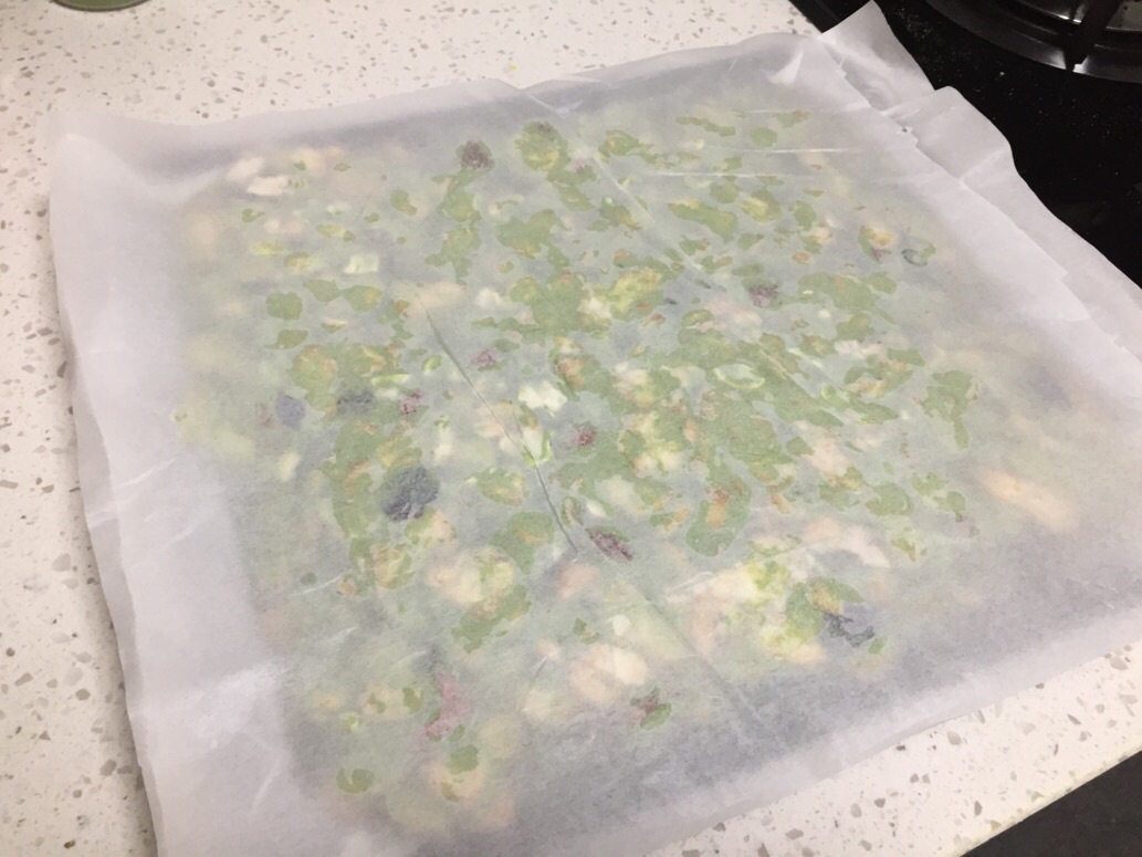 步骤5、然后放烤盘里,上面铺一张油纸,用擀面杖压平压实。