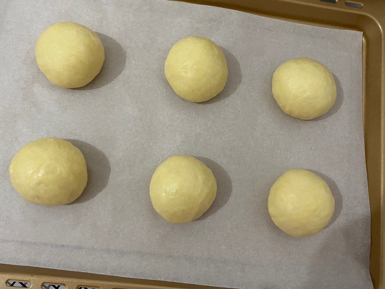 步骤3、给面团排气,分成6份,松弛15分钟,滚圆放入烤盘进行二次发酵