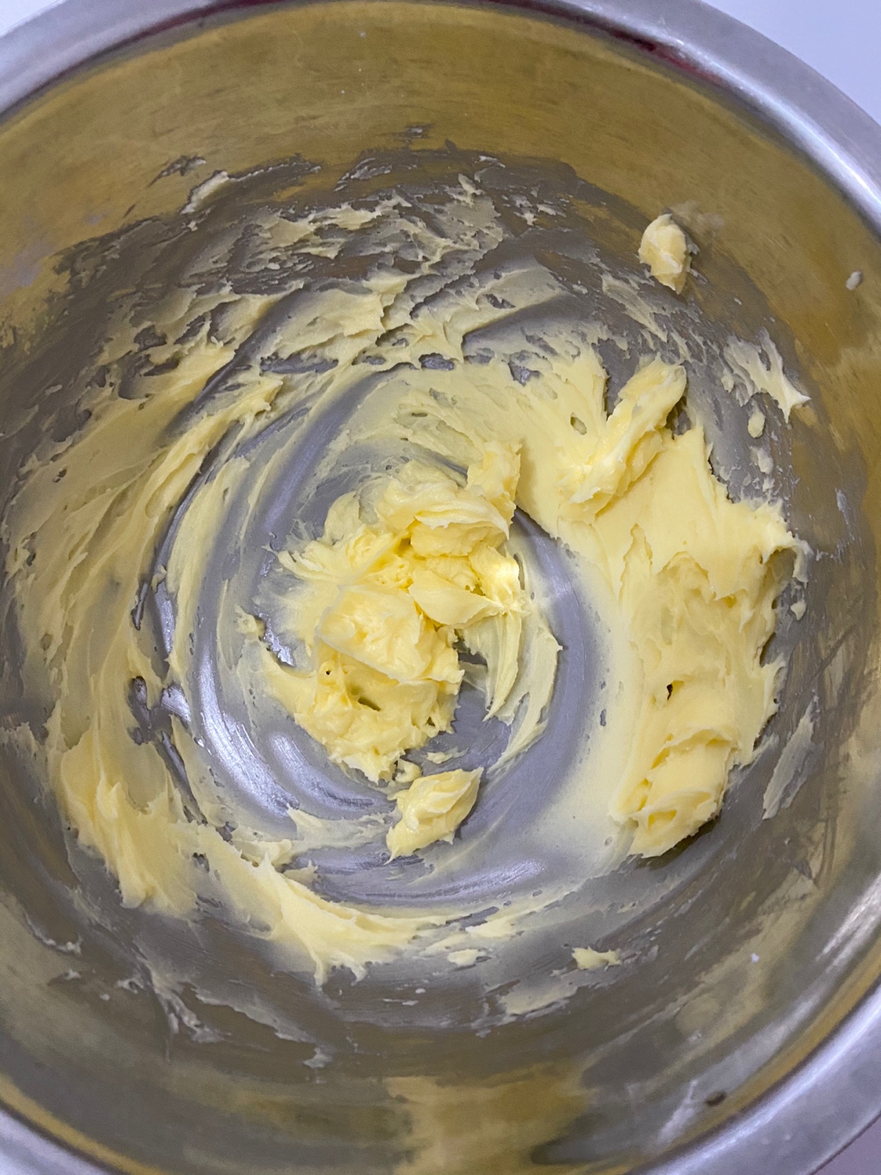 步骤4、面团发酵的时间来做墨西哥酱,黄油软化加入糖粉