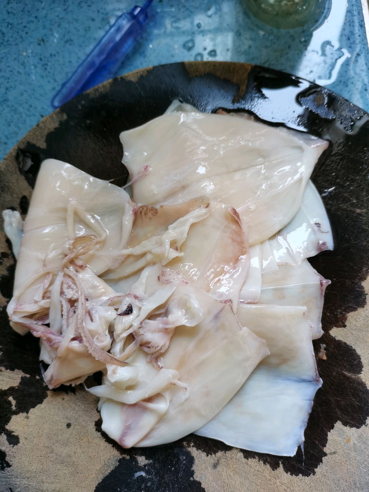 步骤1、墨鱼提前一个晚上泡软,第二天洗干净。
