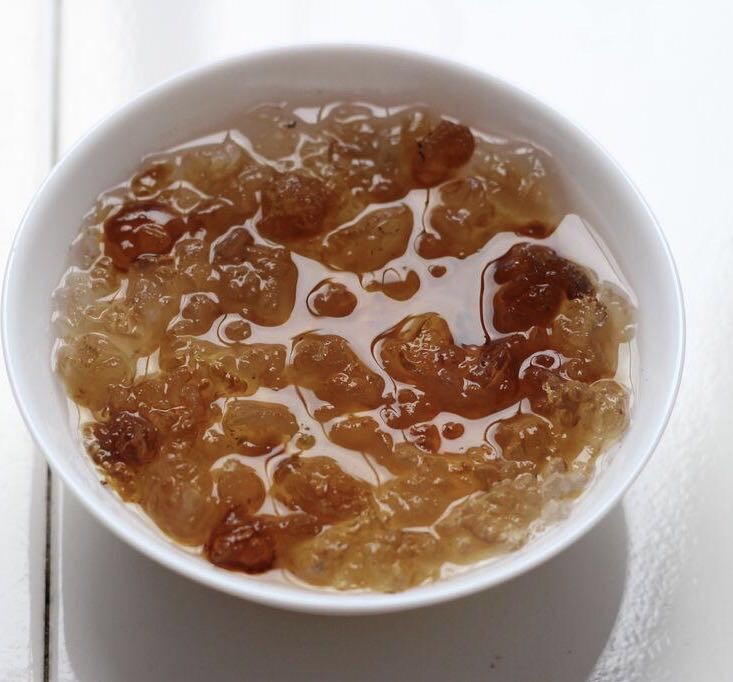 ③看煮的桃胶成品:煮好了口感有着一种Q弹感,如果是煮成水的,一般是老桃胶。