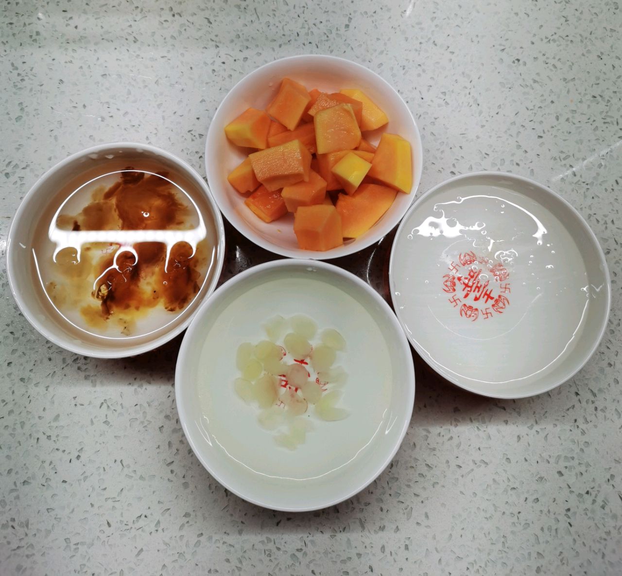 步骤1、桃胶,皂角米,雪燕20小时泡发待用。半个木瓜切块。