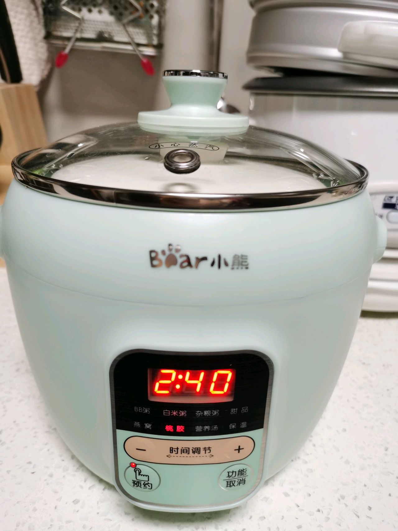 辅料:牛奶100ml、皂角米15粒、雪燕1粒、红枣2颗、枸杞15粒、老冰糖适量